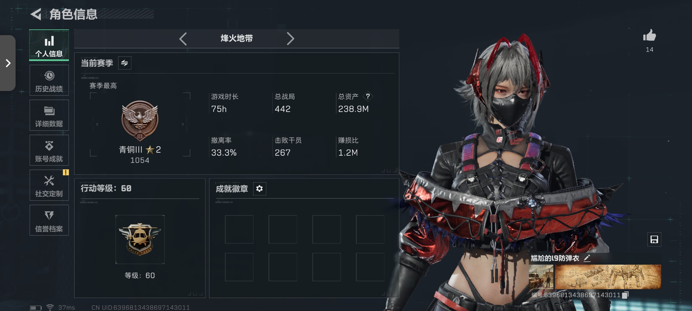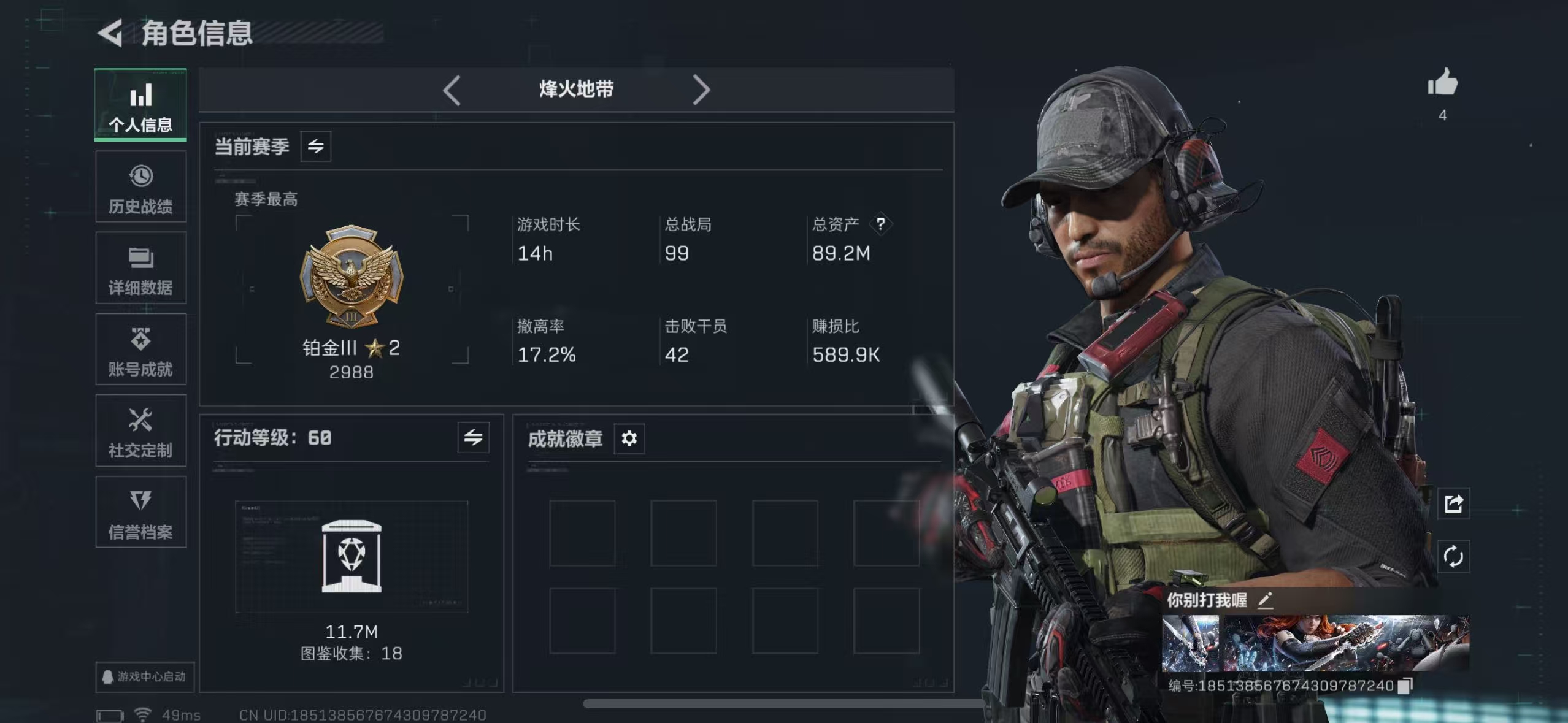 SSXH9224/区服QQ/哈夫币255万/总资产399M/行动等级60/战场等级42/【特战干员】