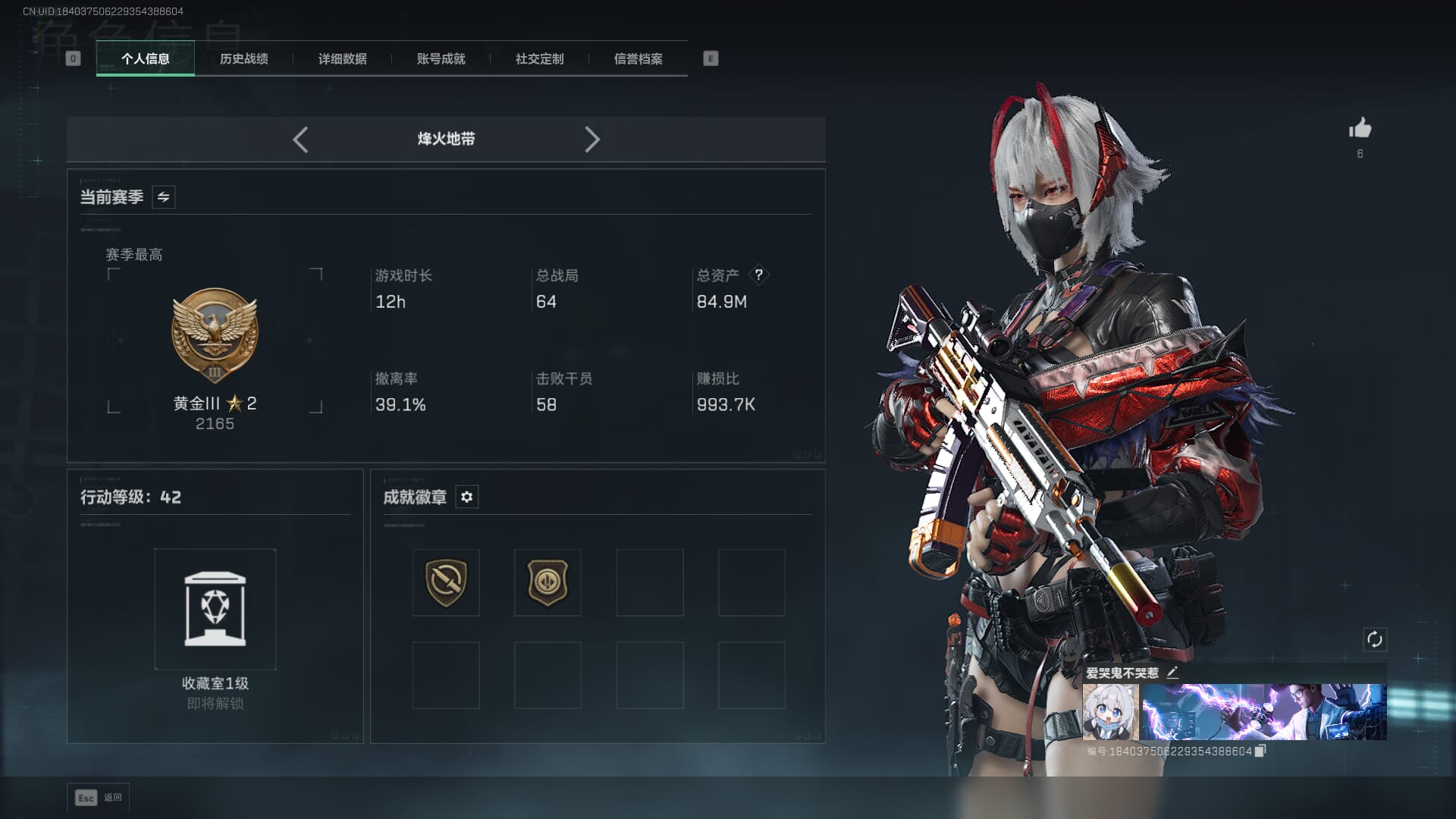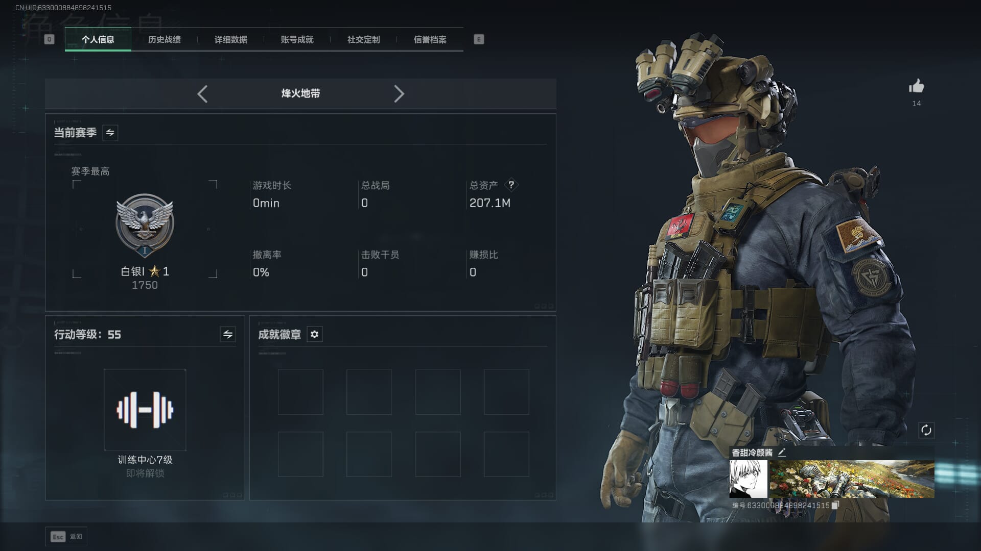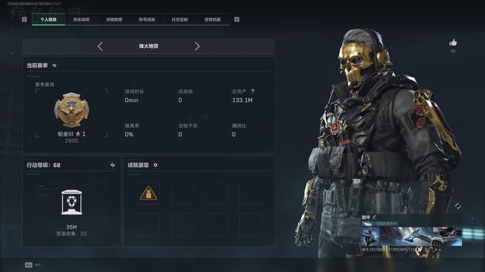 N6374/QQ区/哈夫币874W/总资产217.8M/行动等级60/战场等级14/S7赛季顶级安全