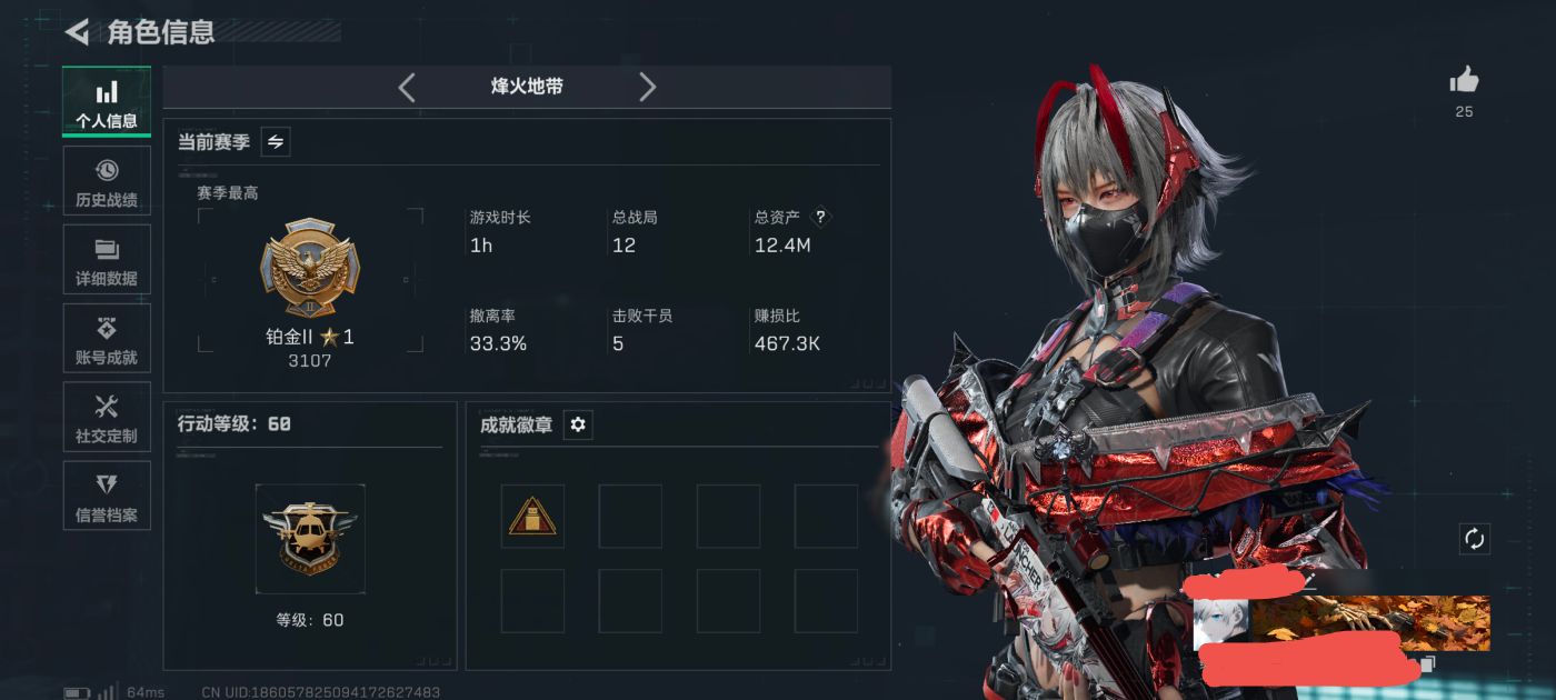 总资产(M):86M/哈夫币(K):76958K/传说枪皮数:22/全面战场等级:50_段位:将军/烽火地带等级:23_段位:白银
