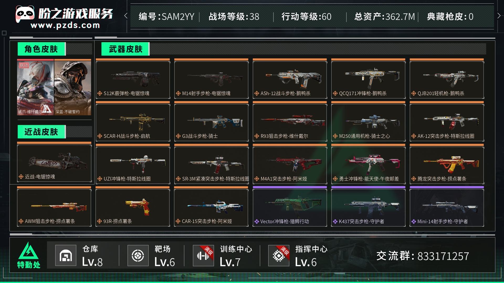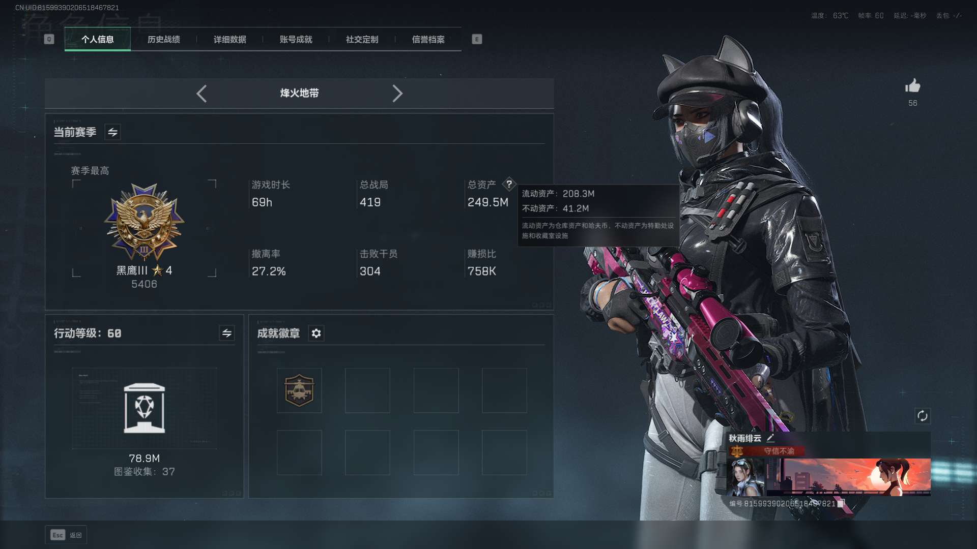 总资产:146M,哈夫币:780W,武器皮肤77,烽火60级:白银,战场4级: