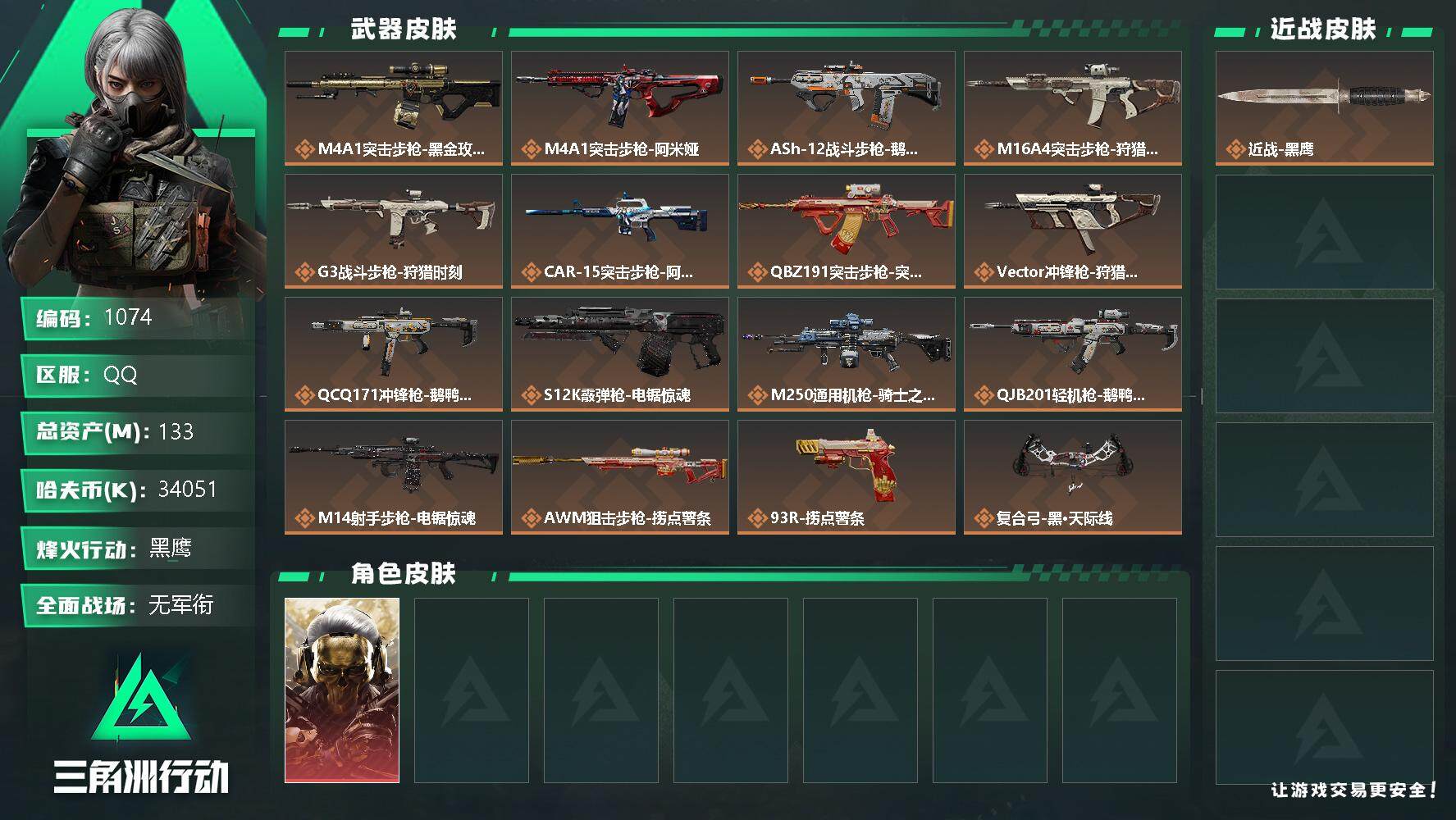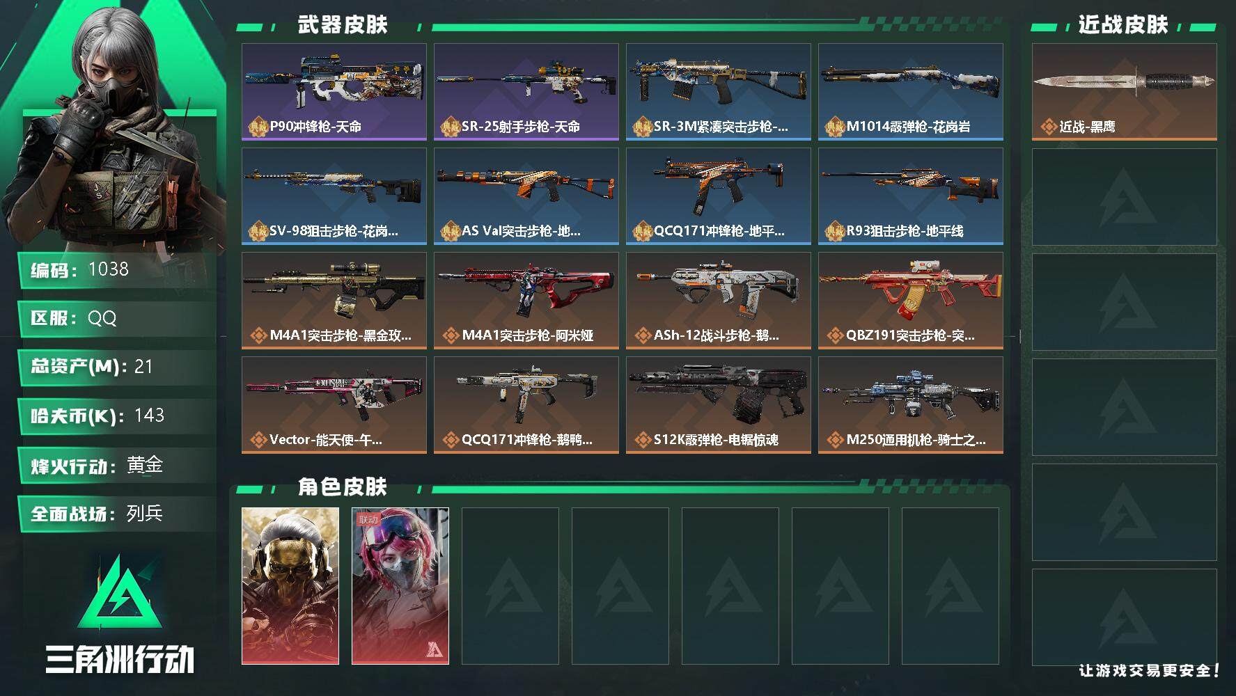 【1051】总资产:166M,哈夫币:420W,武器皮肤104,烽火60级:黑