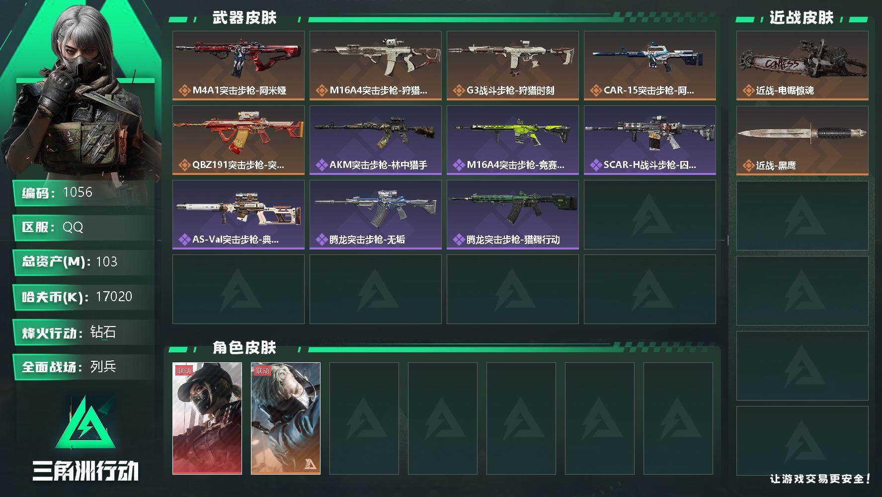 【1056】总资产:103.2M,哈夫币:1702W,武器皮肤132,烽火60