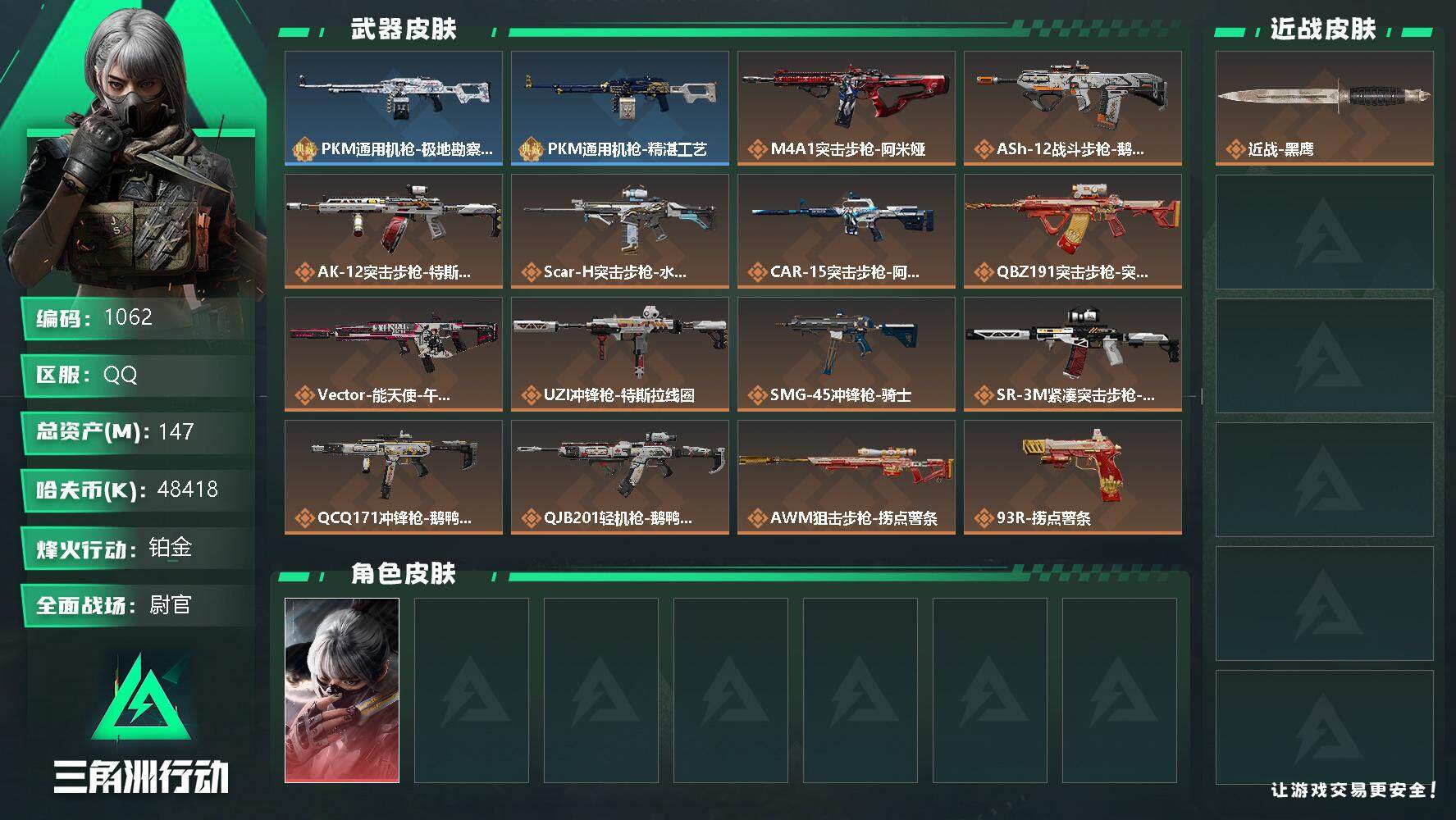 【1043】总资产:157.1M,哈夫币:3568W,武器皮肤93,烽火60级