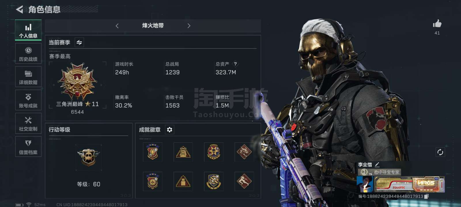 XX959,总资产:49m,段位:三角洲巅峰,等级:60,三角券:359,近战-北极星,红狼-蚀金玫