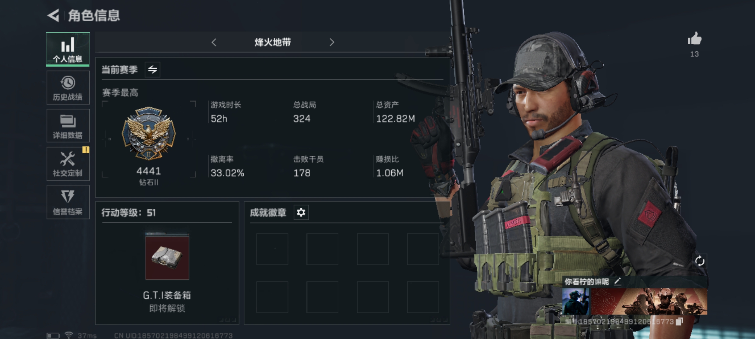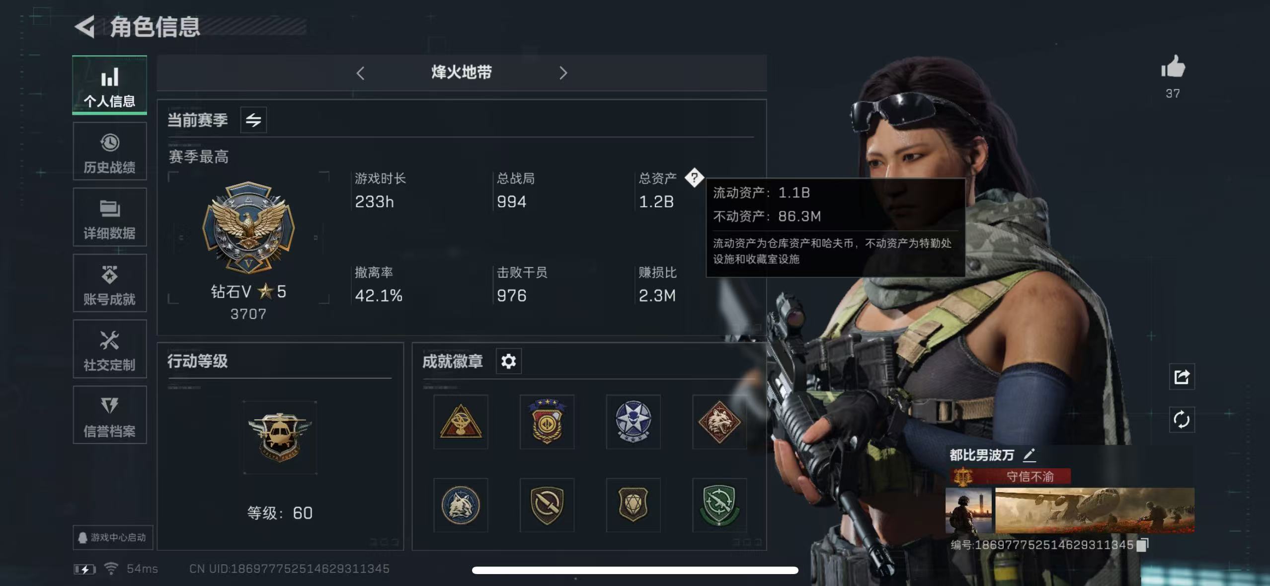 XX943,总资产:124m,段位:三角洲巅峰,等级:60,三角券:305,近战-黑鹰,露娜-黑·天
