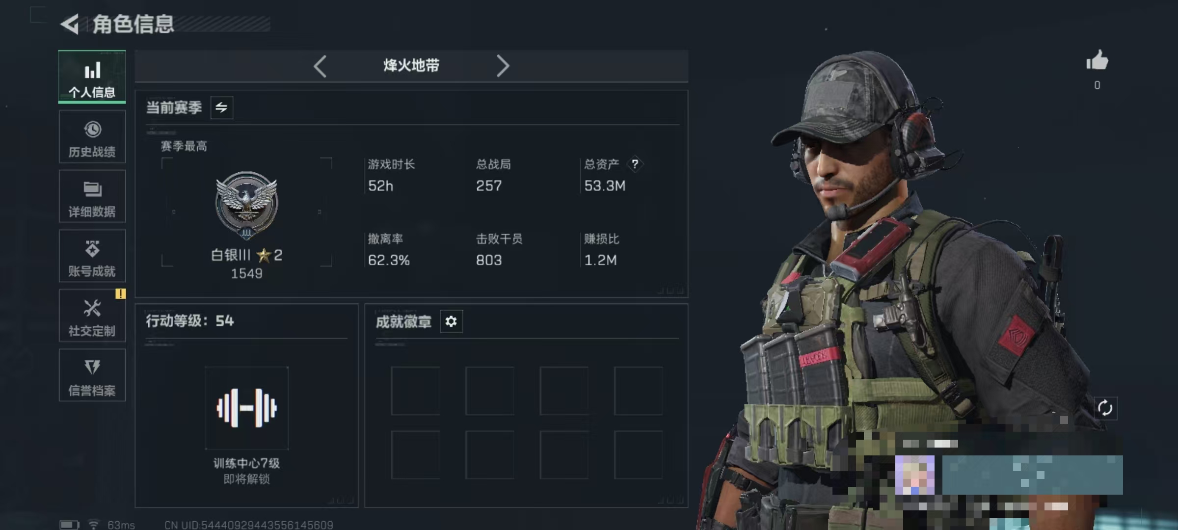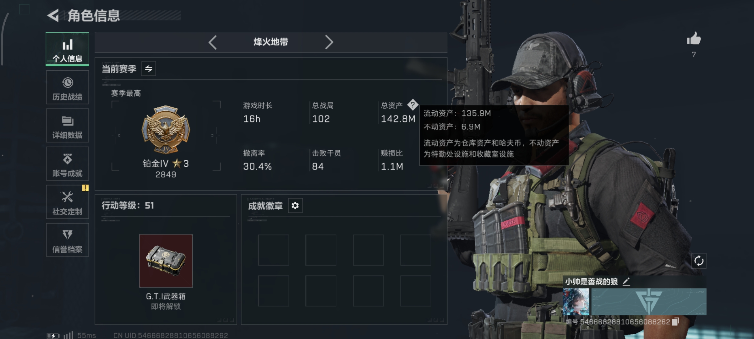 烽火段位白银1 战场段位暂无段位 总资产136M 哈夫币10782W 挂饰3 近战1 载具2
