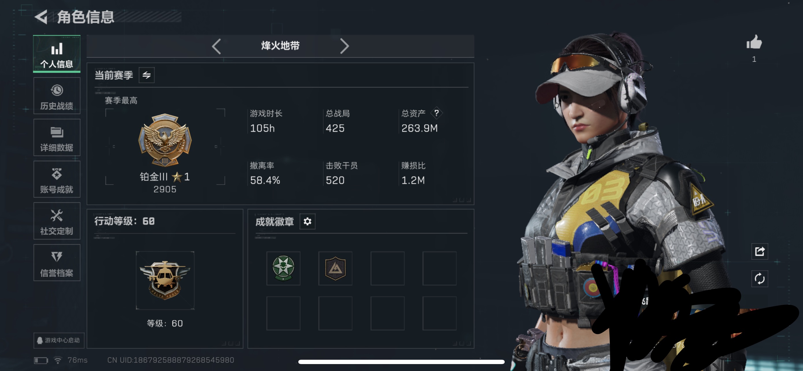 44m总资产-398k哈伏币-60烽火等级-钻石-5战场等级-无军衔【干员外