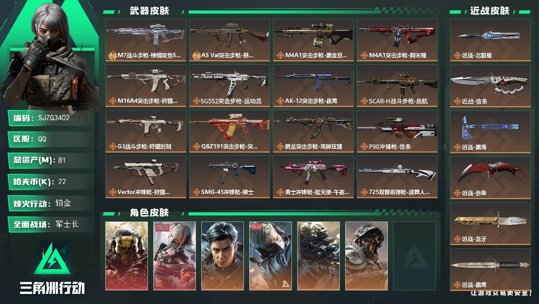 总资产(M):81M/哈夫币(K):22K/传说枪皮数:23/全面战场等级:43_段位:军士长/烽火地带等级:60_段位:铂金/