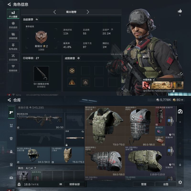 精品成品号 体力5 负重4 仓库有大红 烽火地带段位: 钻石 全面战场段位: 无段位 总资产: 28000000