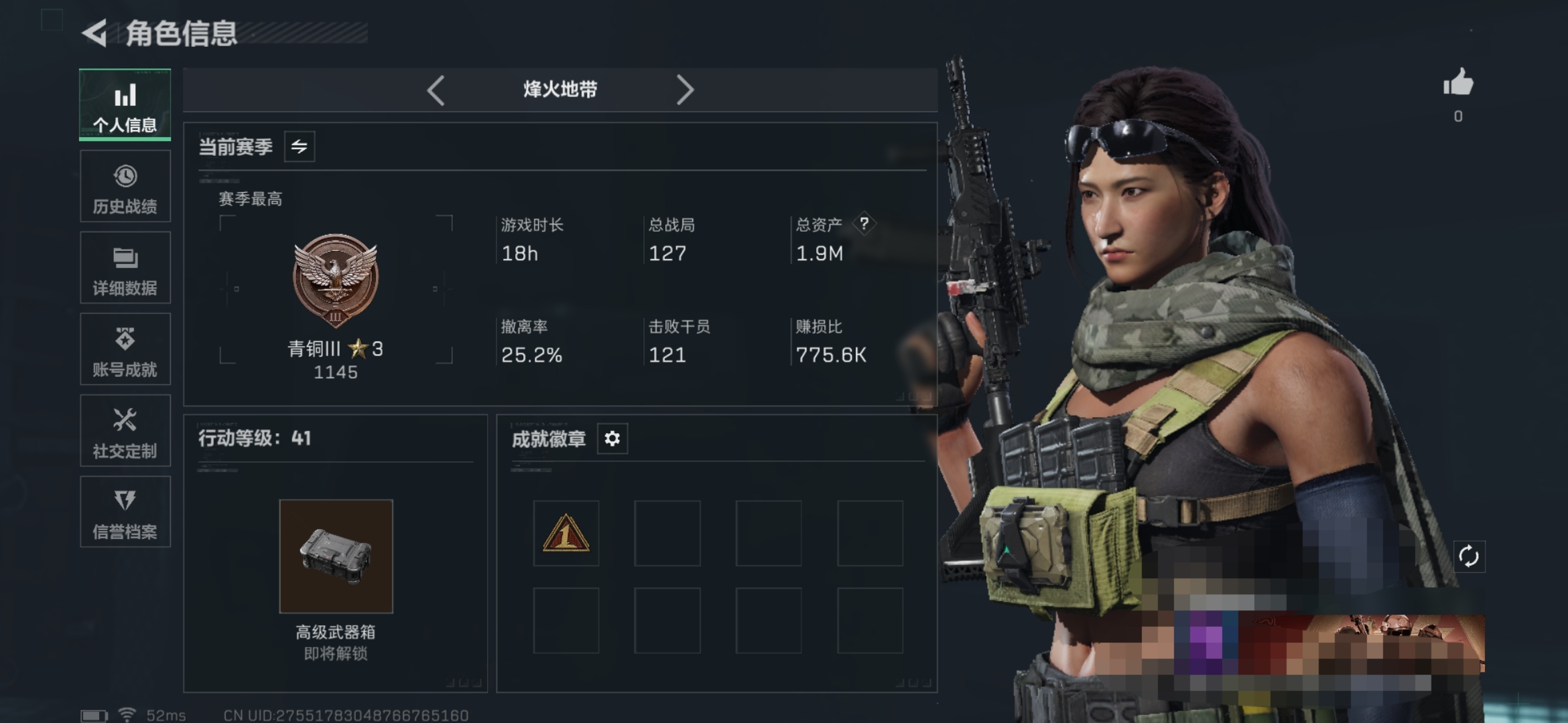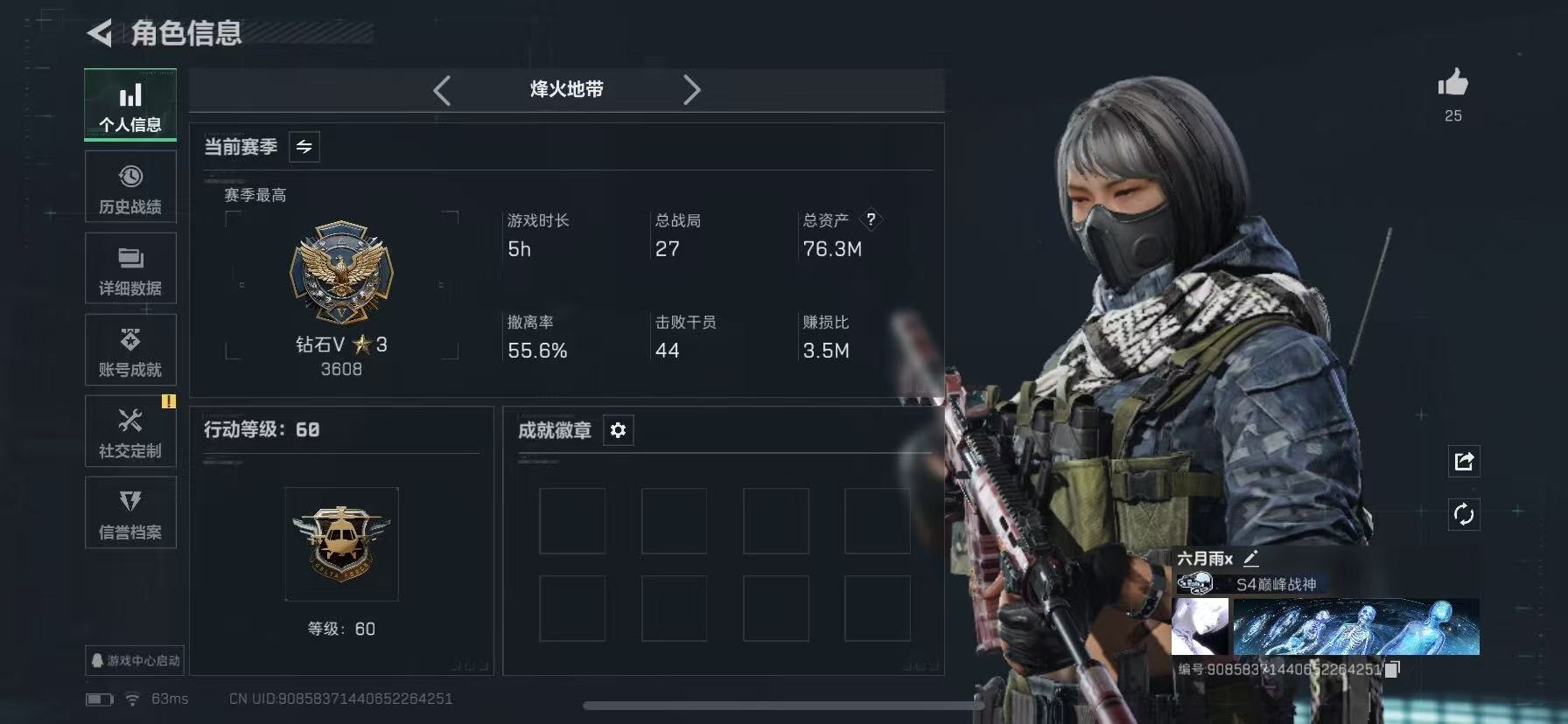 61m总资产-46697k哈伏币-41烽火等级-钻石-1战场等级-无军衔【近
