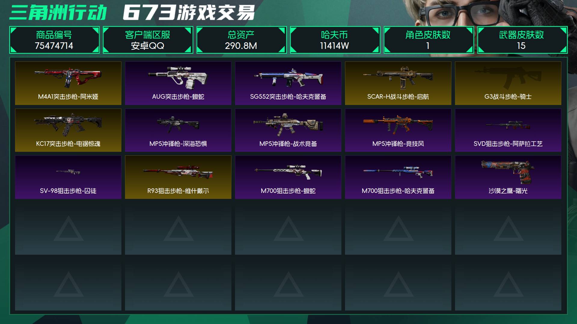 烽火段位铂金3 战场段位列兵2 总资产290.8M 哈夫币11414W 干员1 挂饰7 近战1 枪械15 载具7