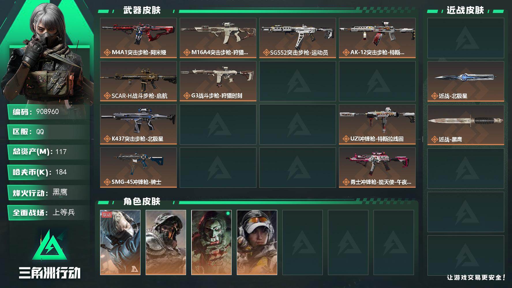 烽火段位黑鹰2 战场段位列兵1 总资产437.6M 哈夫币12025W 干员8 挂饰27 近战4 枪