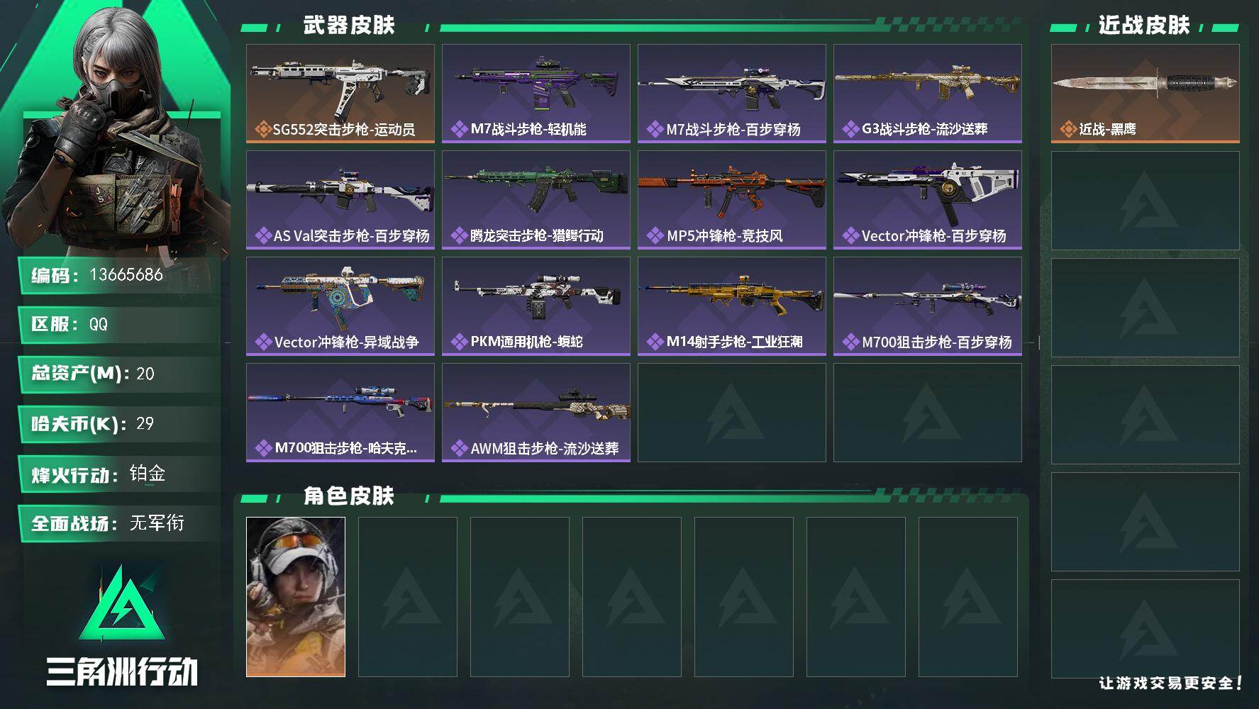 总资产(M):20M/哈夫币(K):29K/哈夫币(K):29K/传说枪皮数: