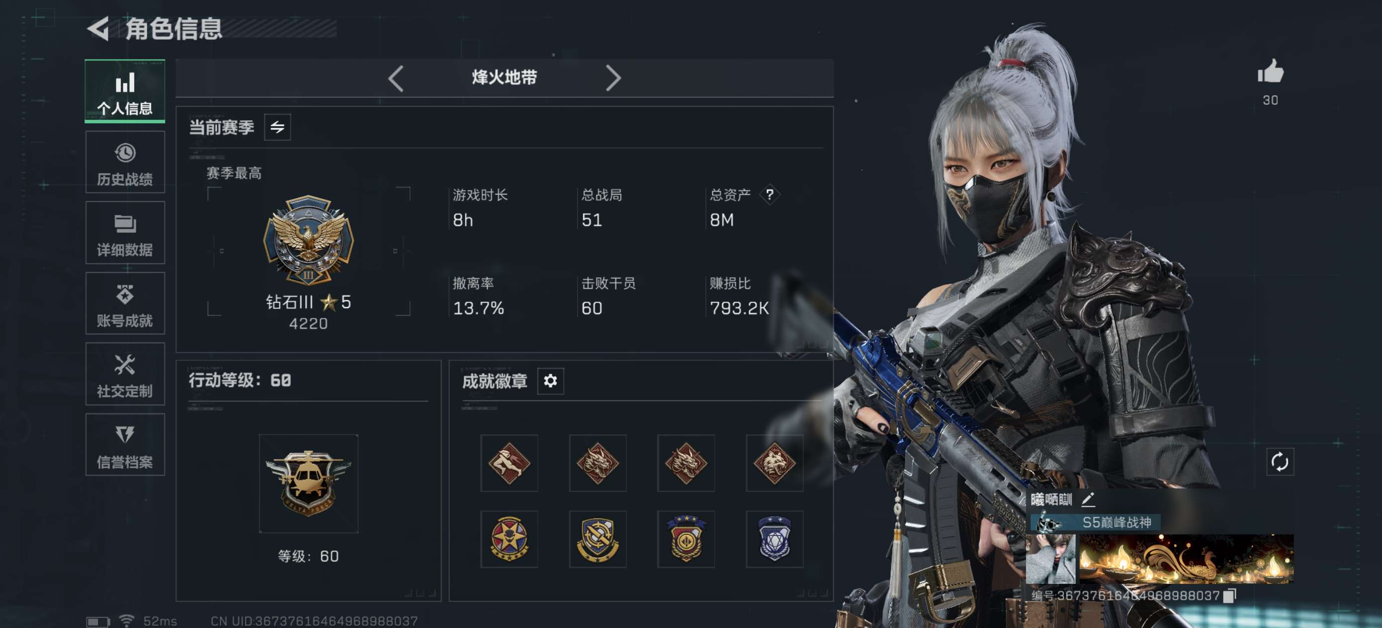 总资产(M):10M/哈夫币(K):888K/传说枪皮数:9/全面战场等级:37_段位:军士长/烽火地带等级:60_段位:钻石/