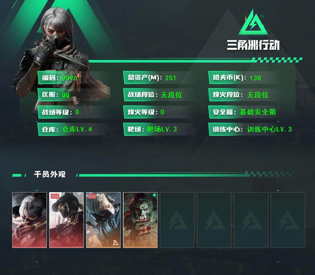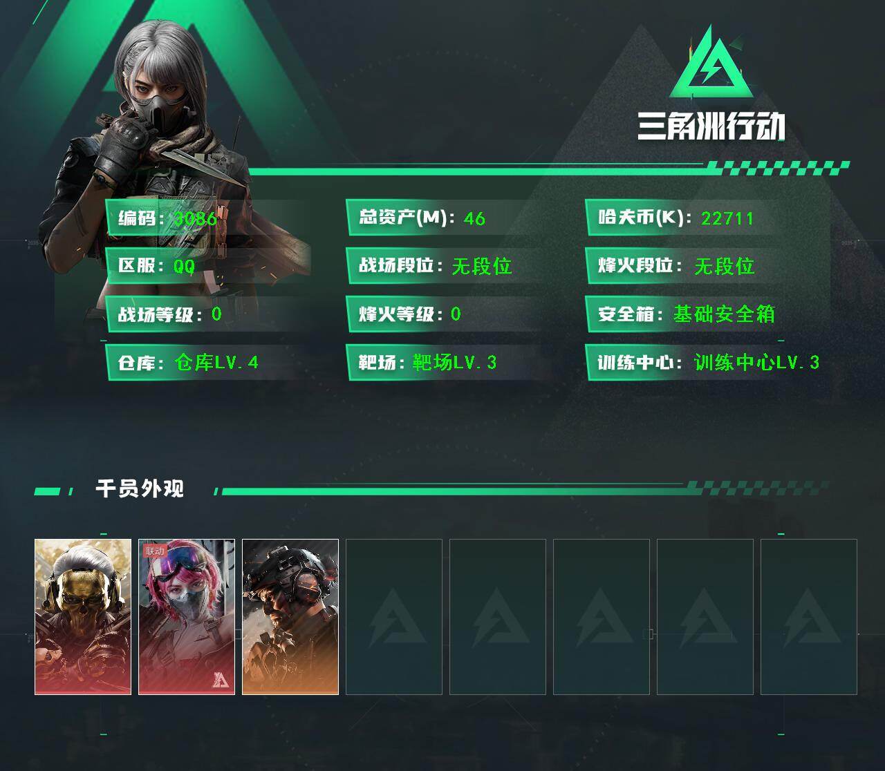 总资产(M):259M/哈夫币(K):20980K/传说枪皮数:22/全面战场等级:50_段位:上等兵/烽火地带等级:60_段位:黑鹰