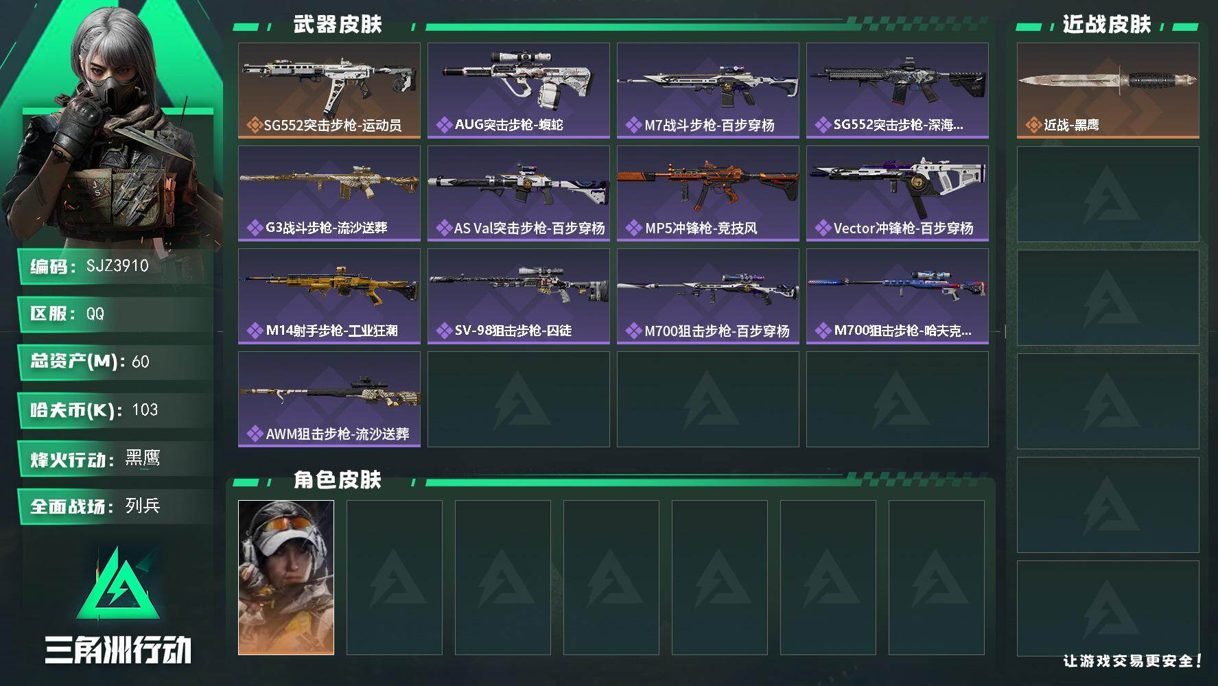 总资产(M):60M/哈夫币(K):103K/传说枪皮数:1/全面战场等级:8_段位:列兵/烽火地带等级:60_段位:黑鹰/