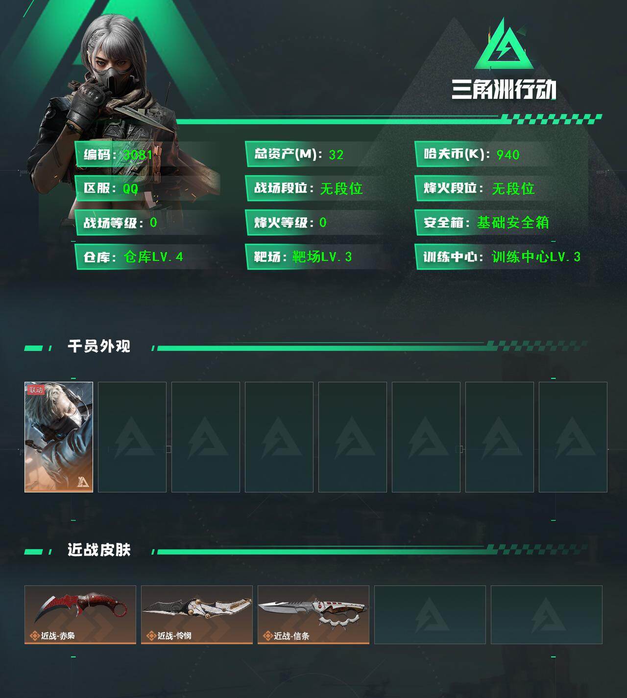 总资产(M):45M/哈夫币(K):415K/全面战场等级:15_段位:列兵/烽火地带等级:60_段位:青铜/