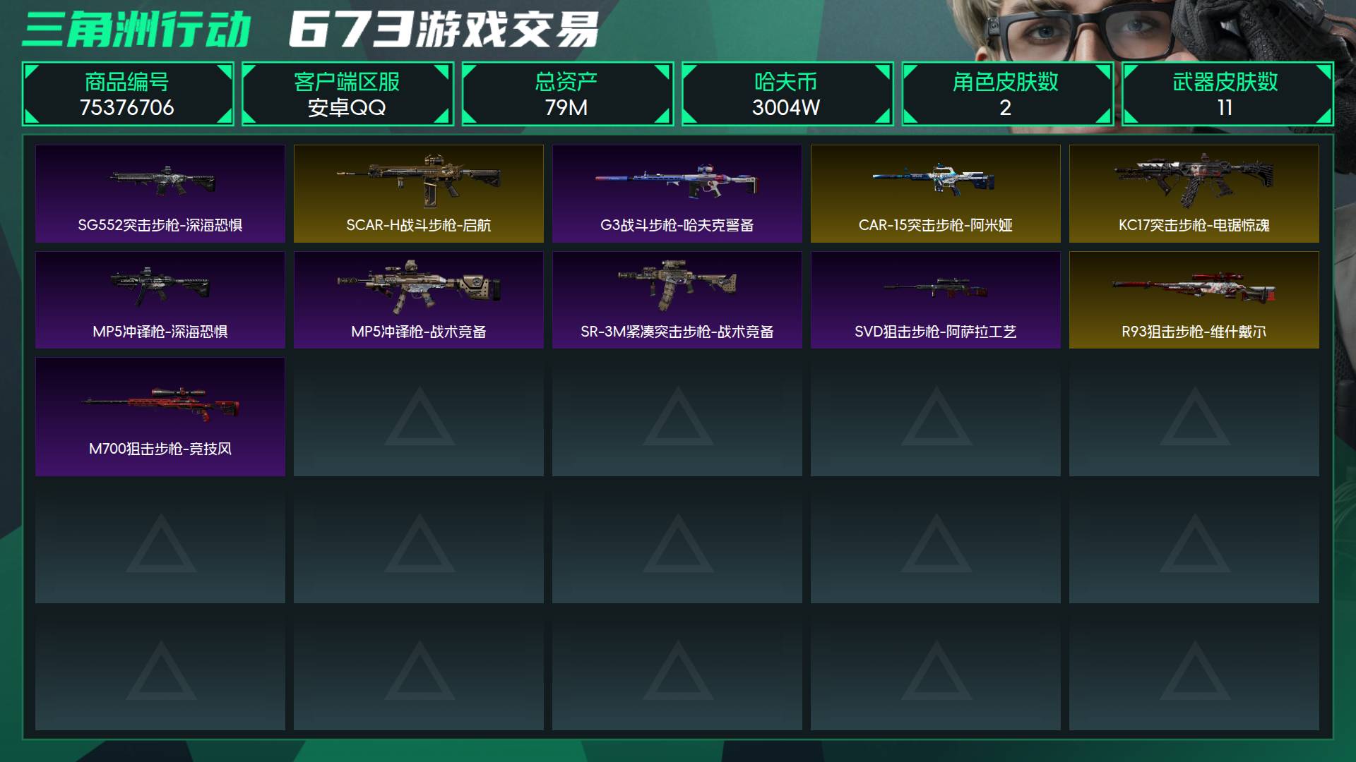 烽火段位白银2 战场段位暂无段位 总资产79M 哈夫币3004W 干员2 挂饰8 近战1 枪械11