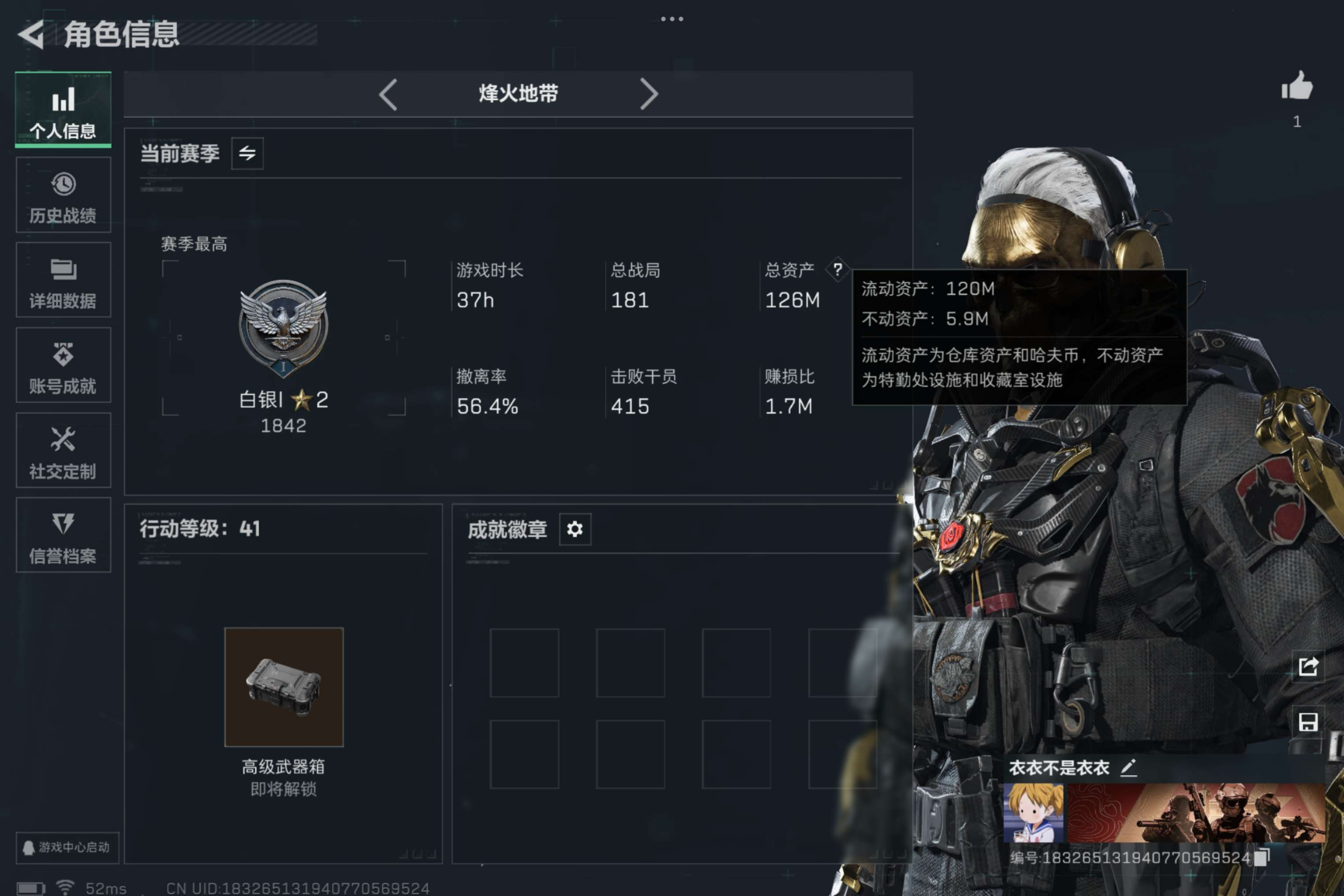 总资产(M):121M/哈夫币(K):1988K/传说枪皮数:18/全面战场等级:45_段位:军士长/烽火地带等级:60_段位:黑鹰