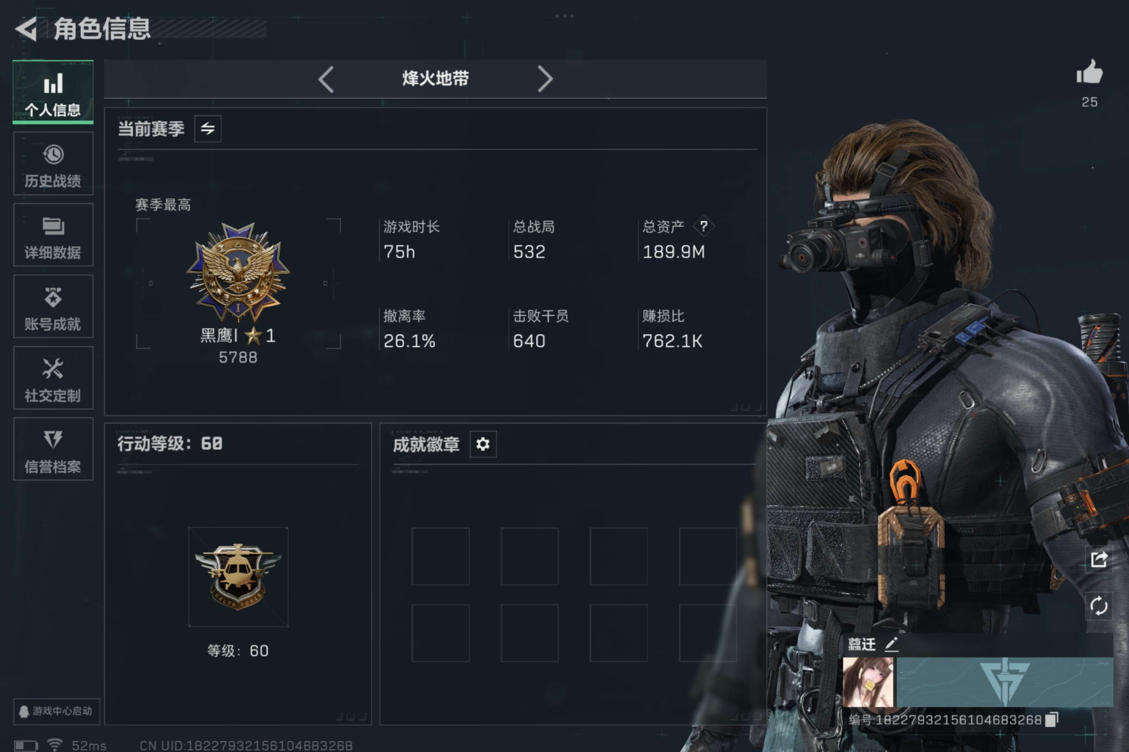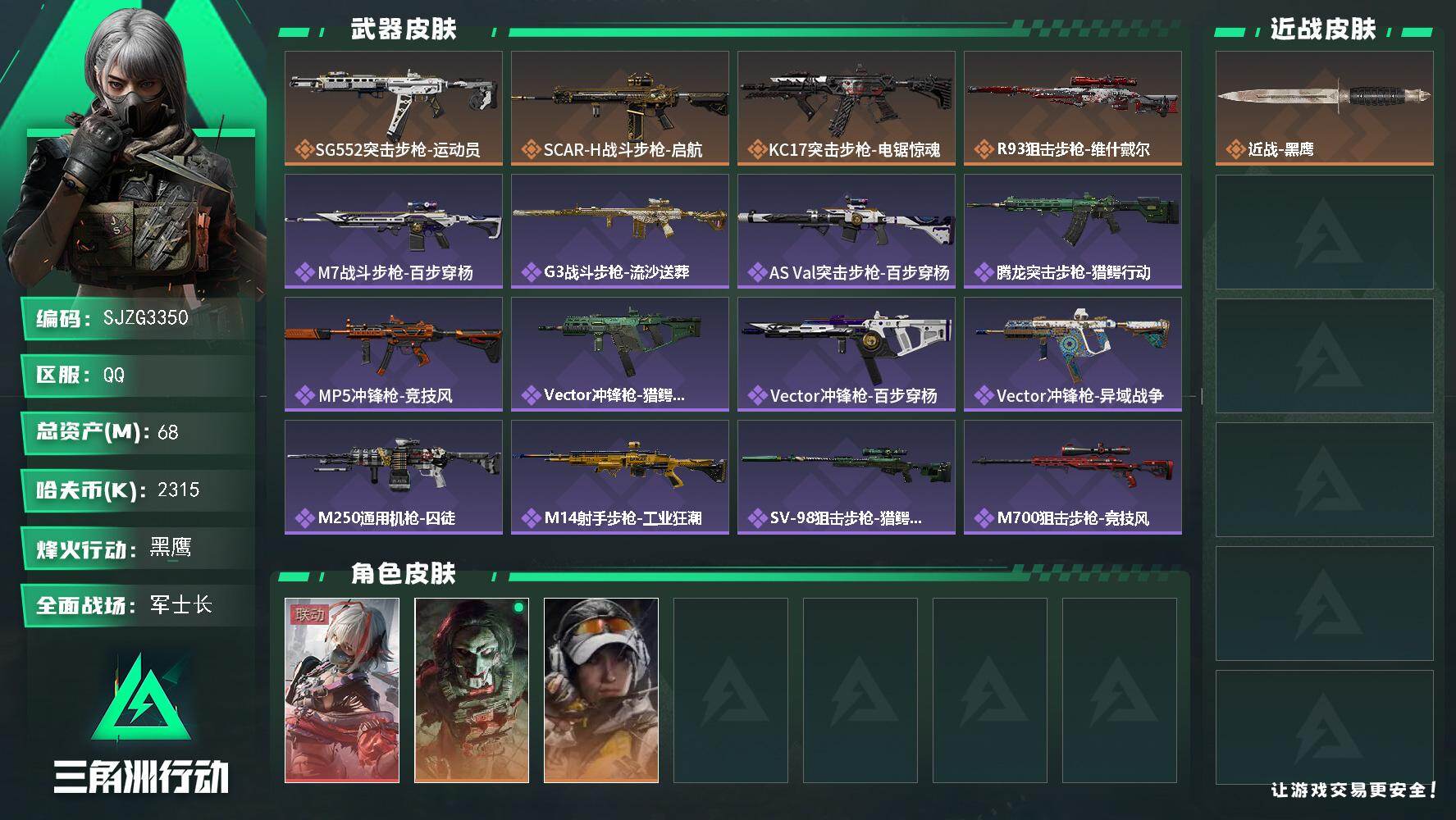 总资产(M):68M/哈夫币(K):2315K/传说枪皮数:4/全面战场等级:18_段位:军士长/烽火地带等级:60_段位:黑鹰/