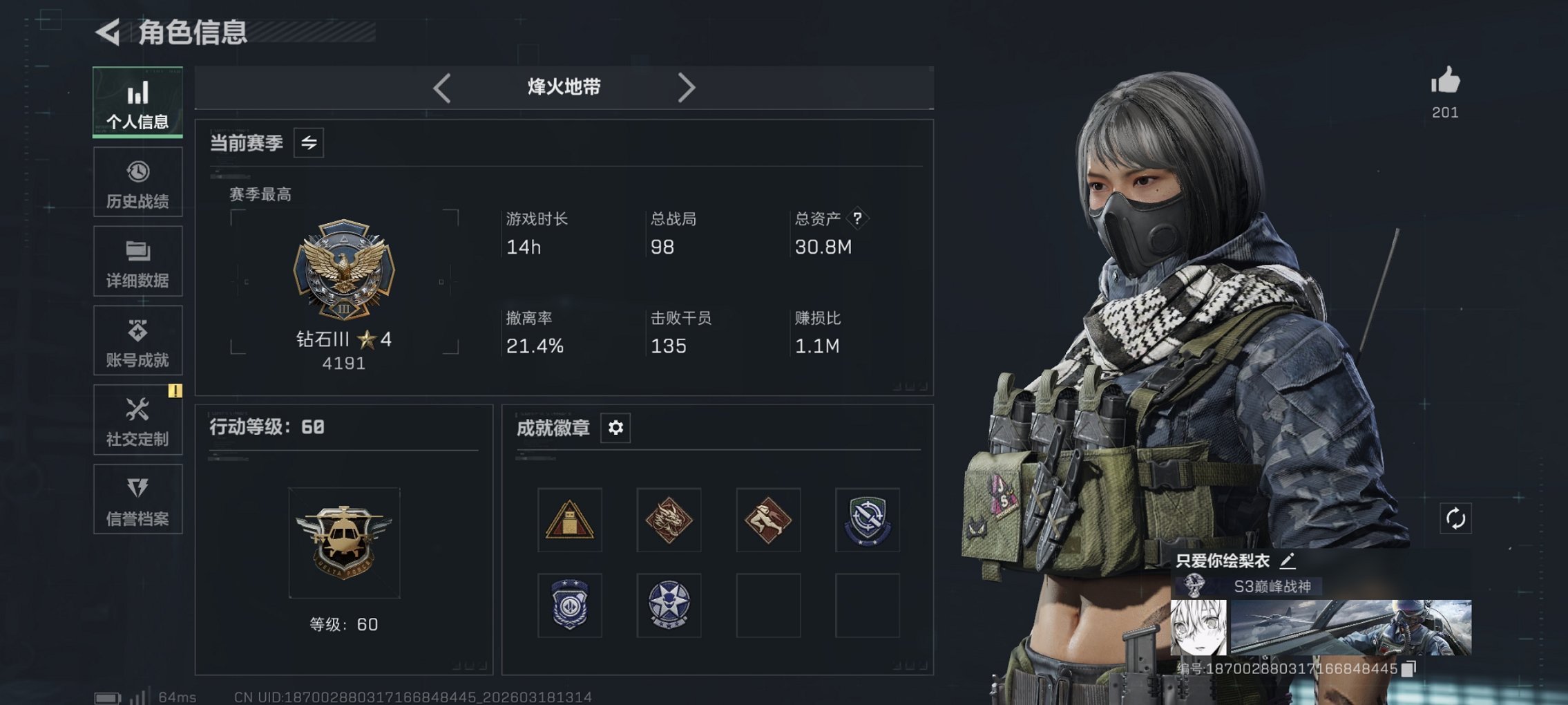 148m总资产-2122k哈夫币-60烽火等级-钻石-5战场等级-无军衔【干