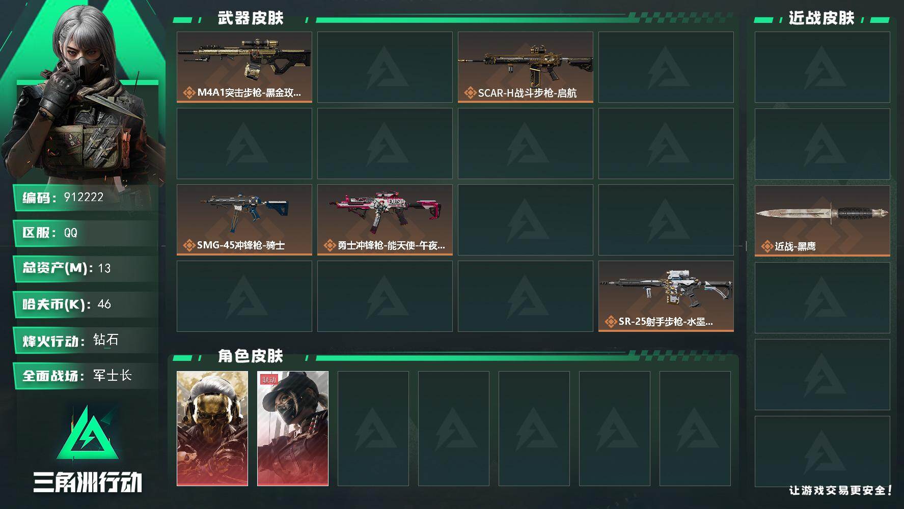 13m总资产-46k哈夫币-60烽火等级-钻石-50战场等级-军士长【干员外