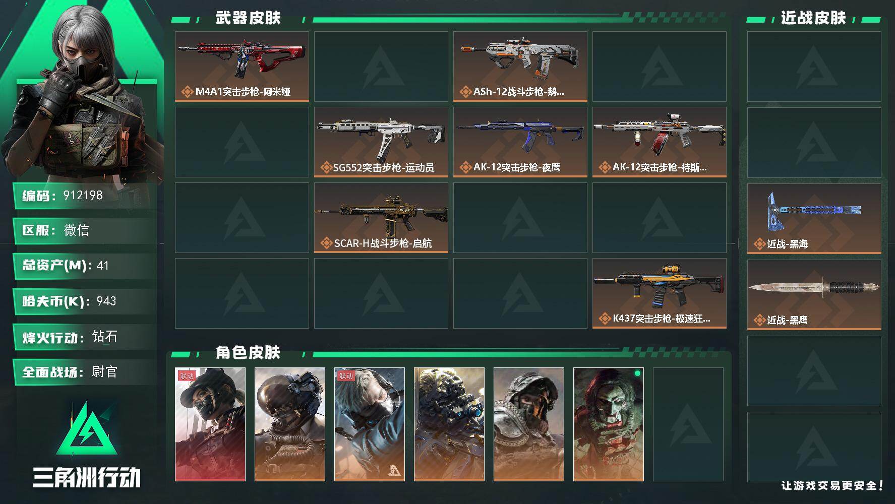 41m总资产-943k哈夫币-60烽火等级-钻石-50战场等级-尉官