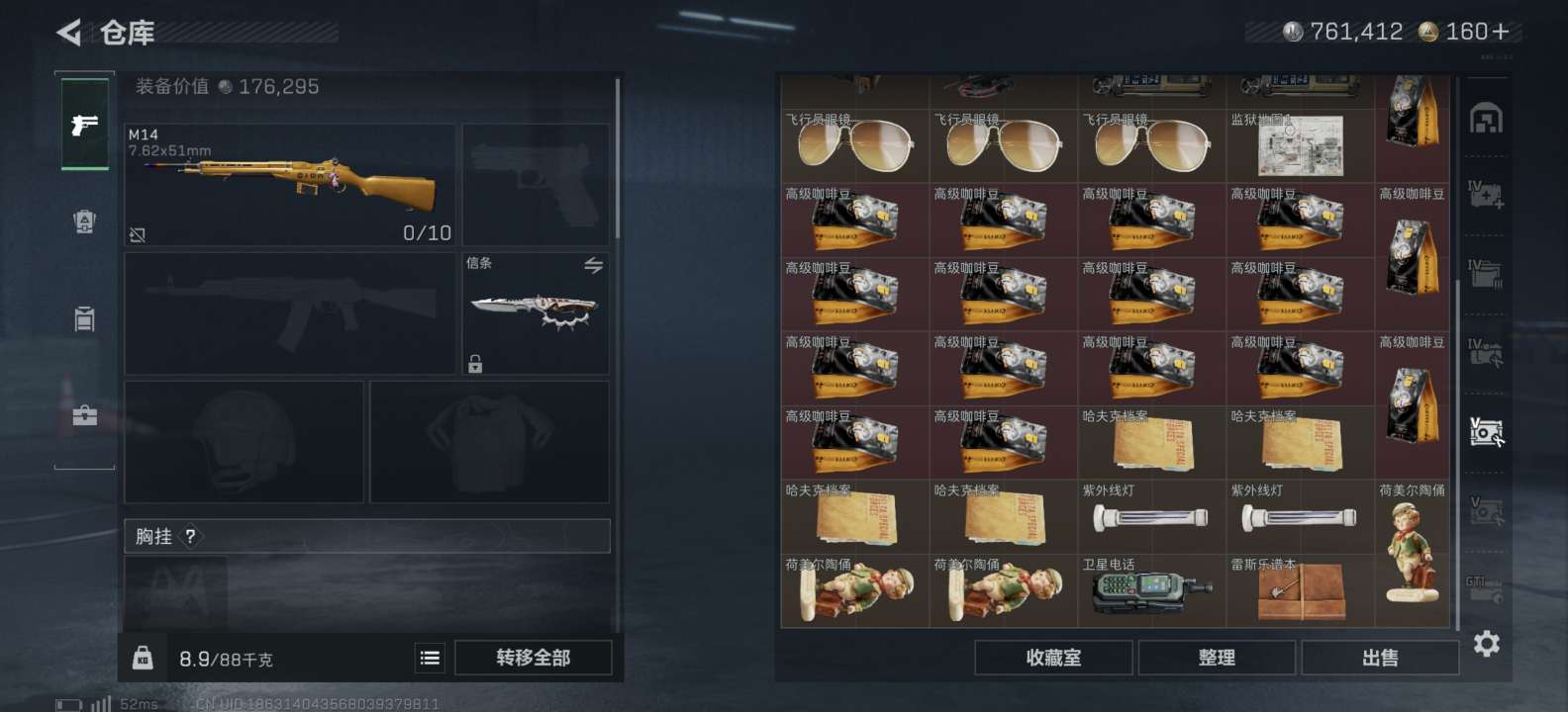信条刀皮,电锯捆绑九格保险,86发aW,17咖啡豆满满负重,200M流动资产,83M收藏室,一颗非洲