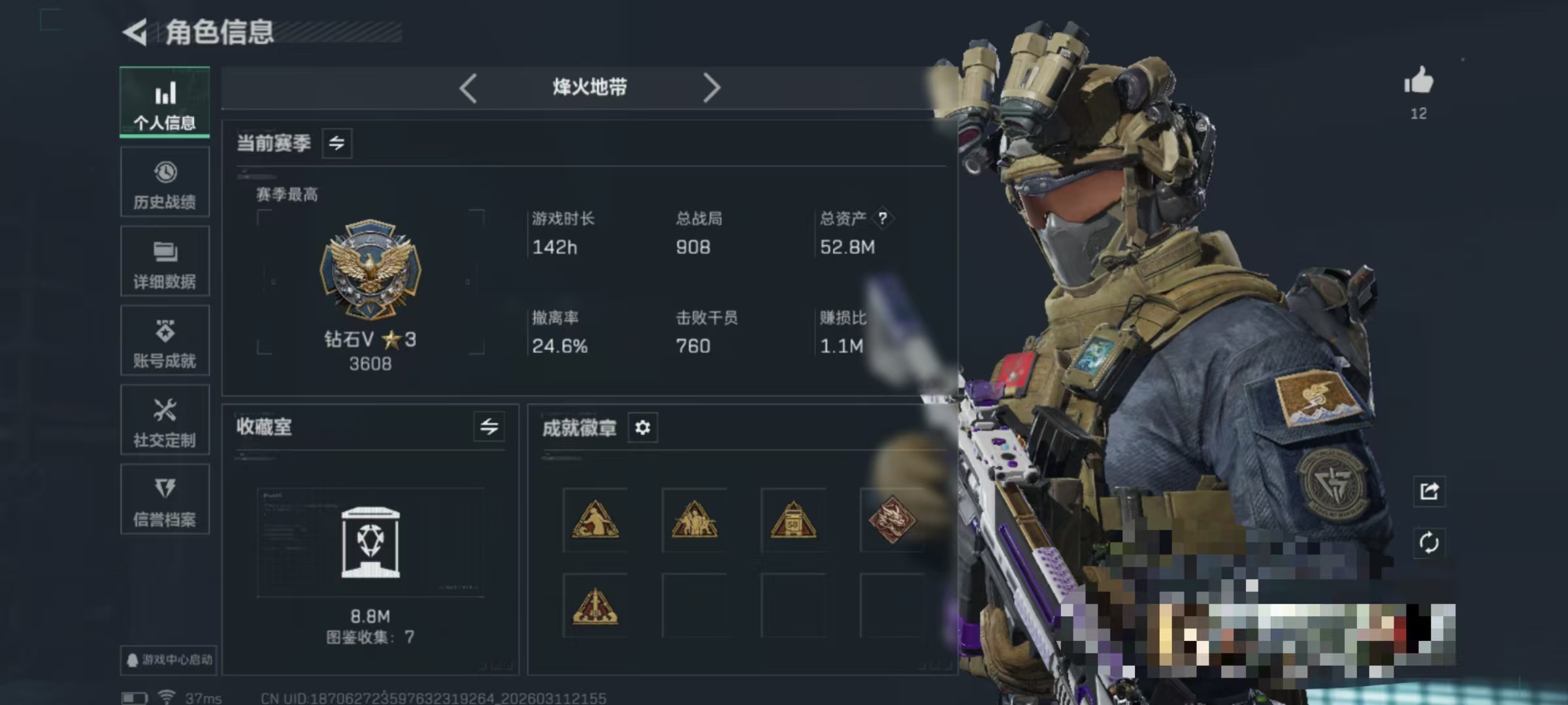 104m总资产-4256k哈伏币-60烽火等级-钻石-37战场等级-上等兵