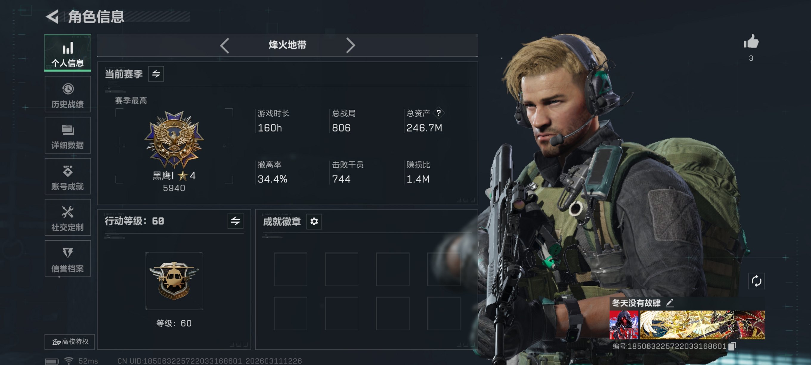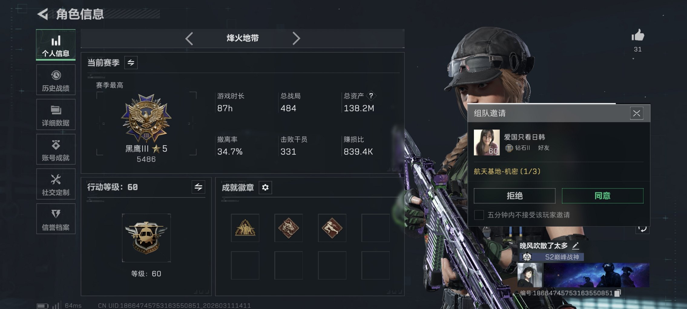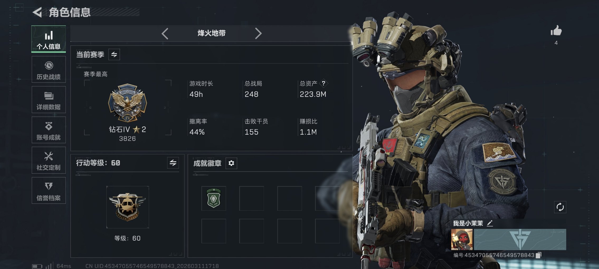 164m总资产-78k哈伏币-60烽火等级-钻石-21战场等级-上等兵【干员