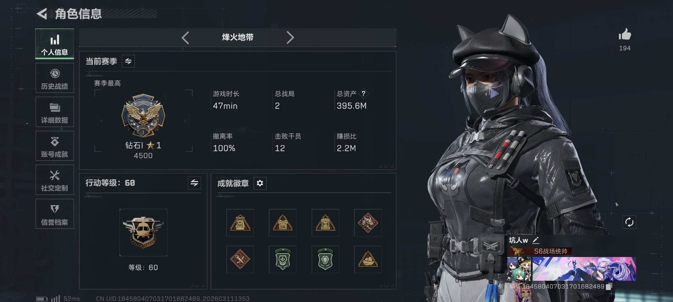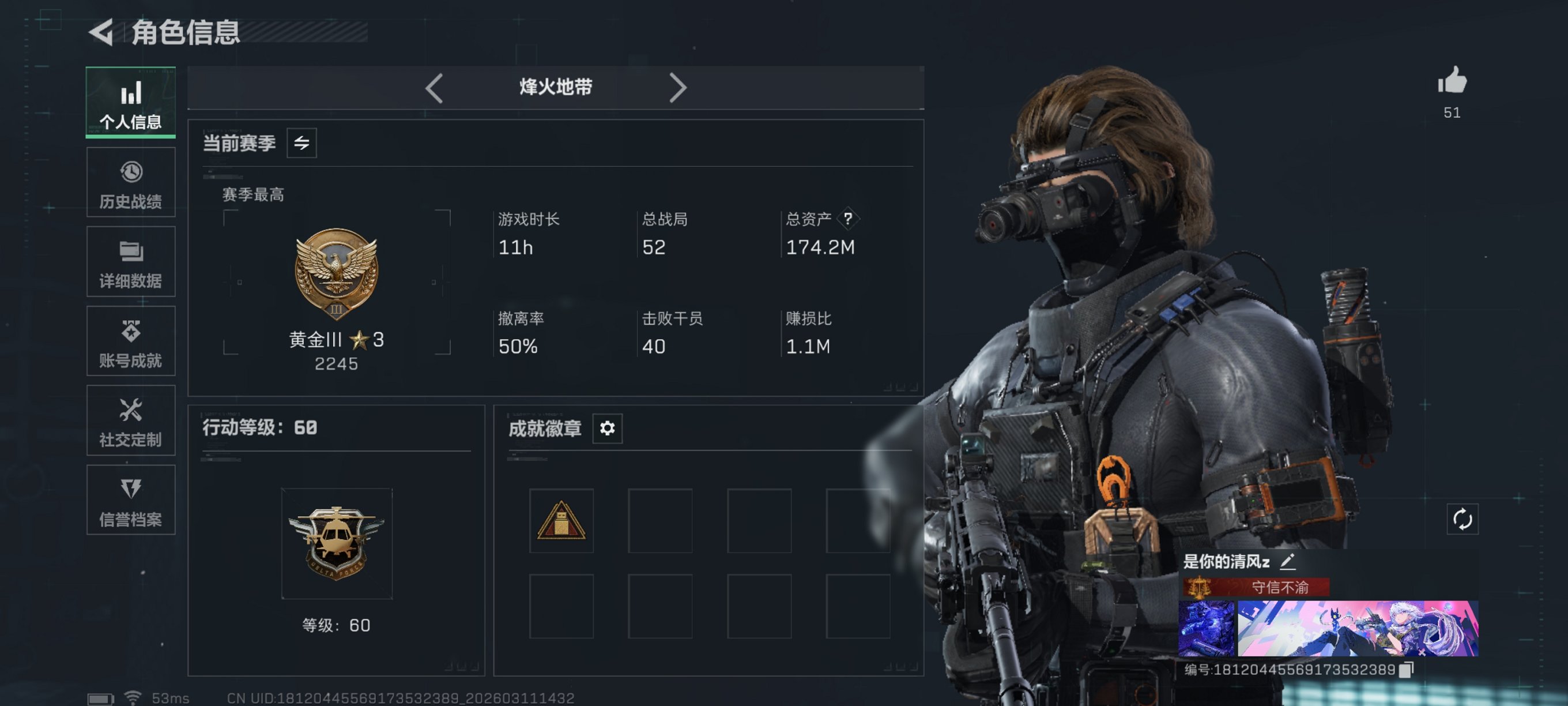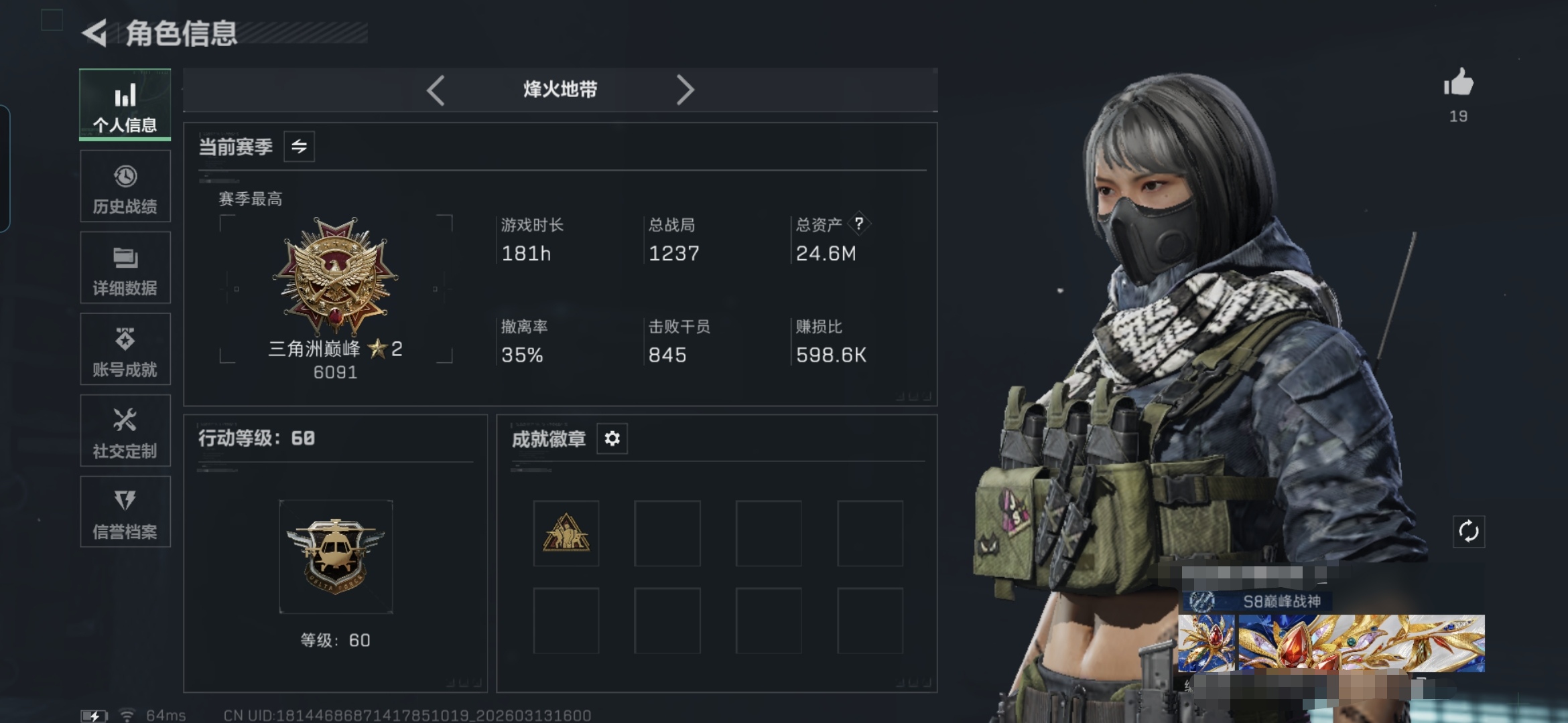 164m总资产-78k哈伏币-60烽火等级-钻石-21战场等级-上等兵【干员