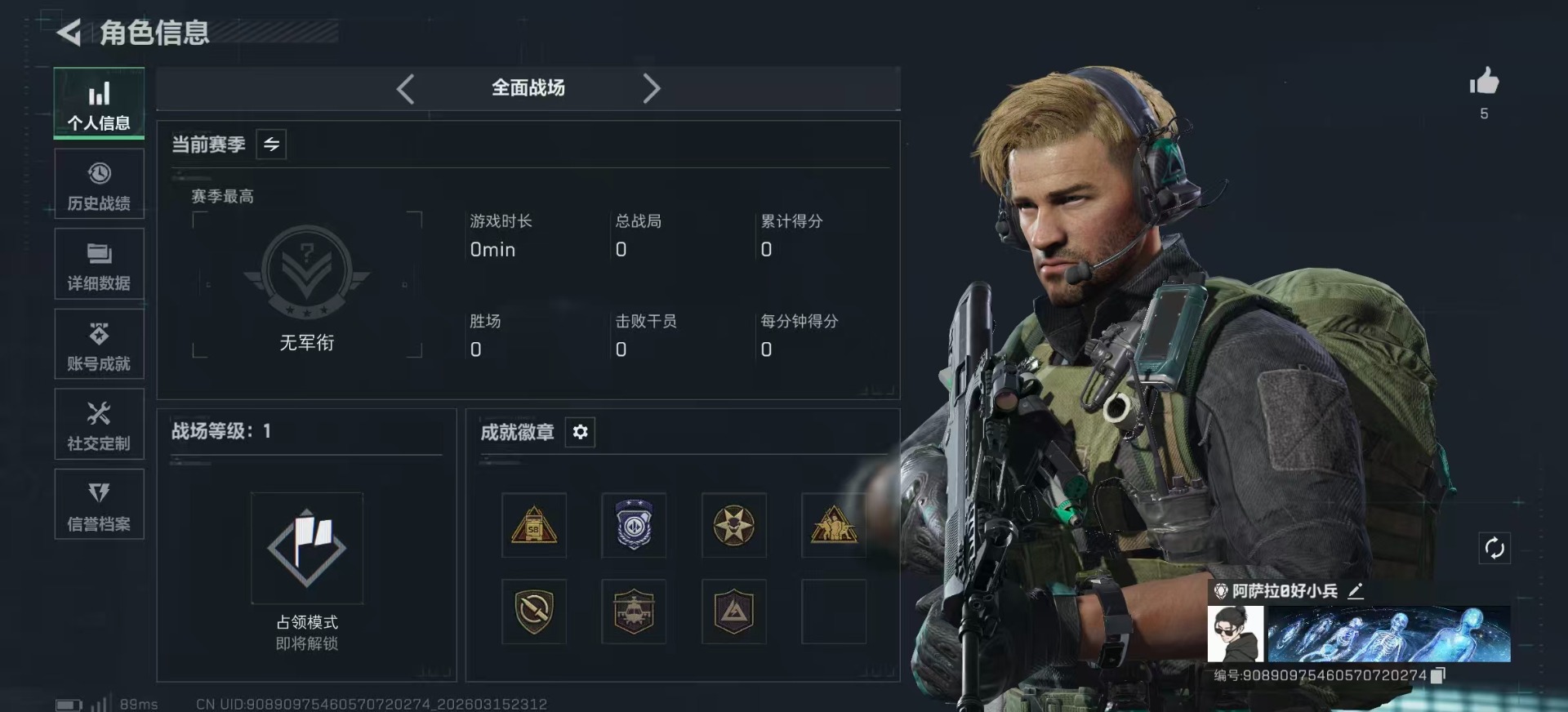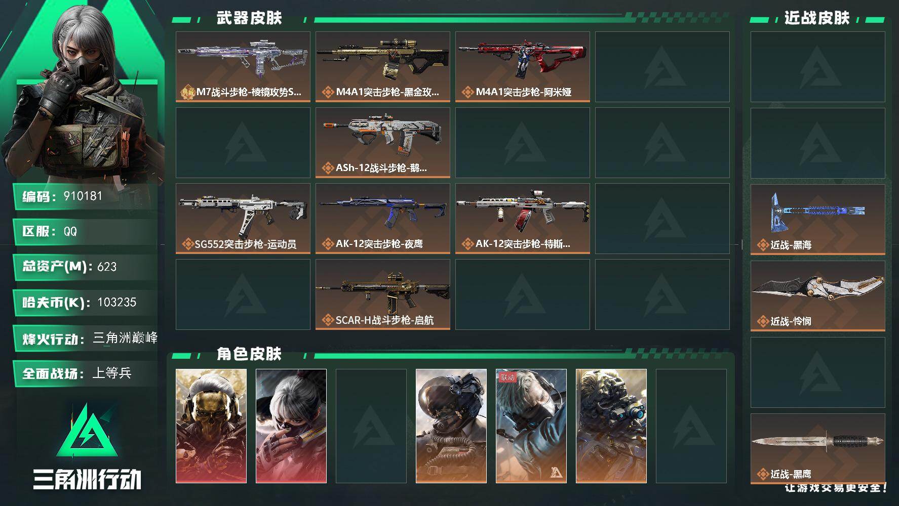 总资产(M):123M/哈夫币(K):14961K/传说枪皮数:18/全面战场等级:20_段位:上等兵/烽火地带等级:60_段位:黑鹰/