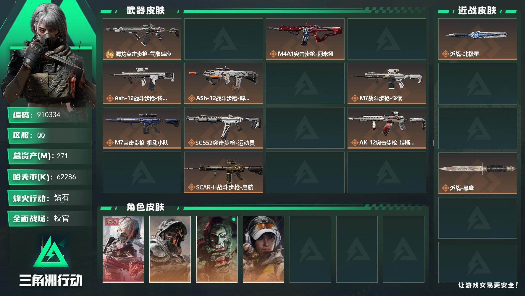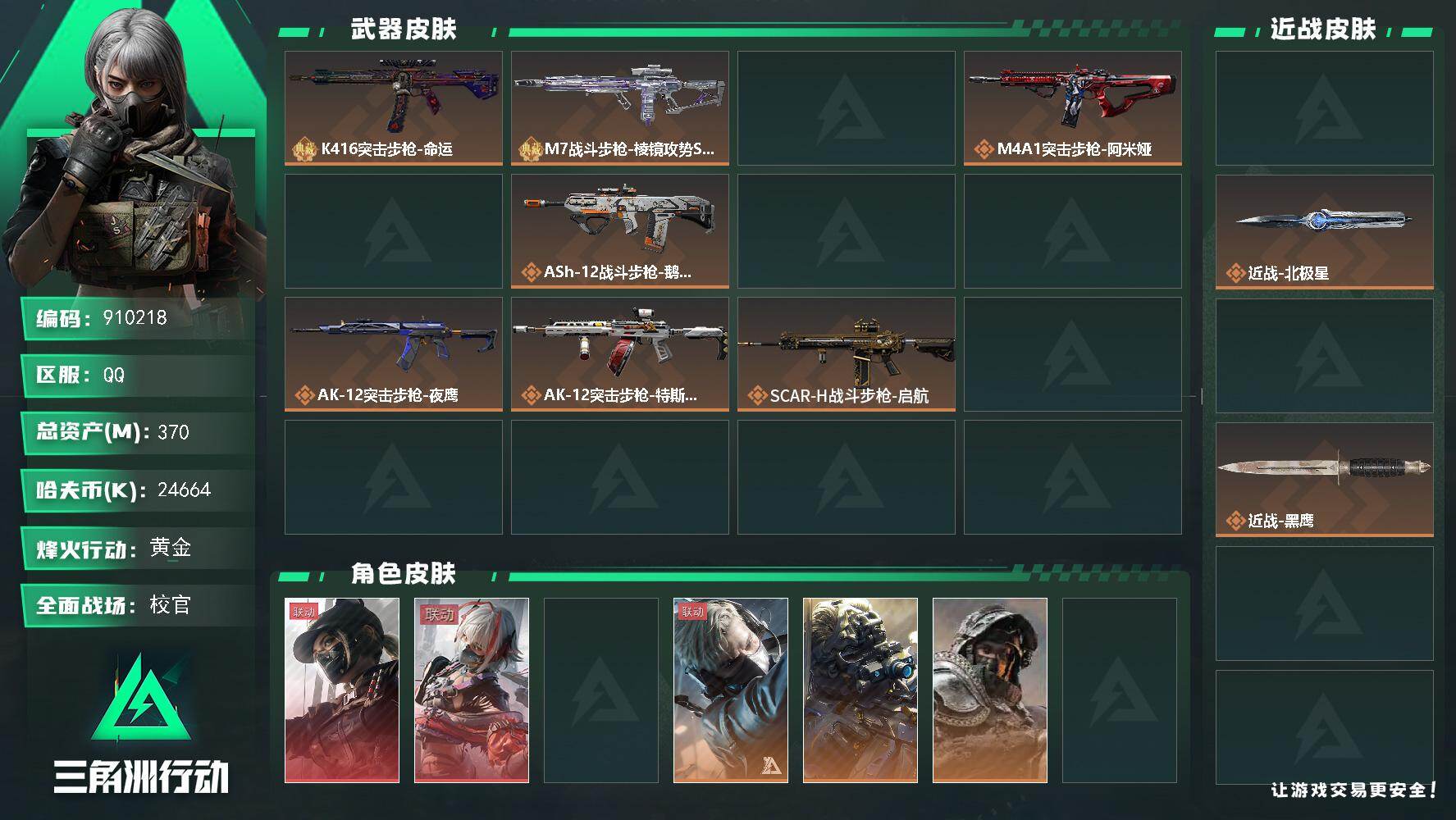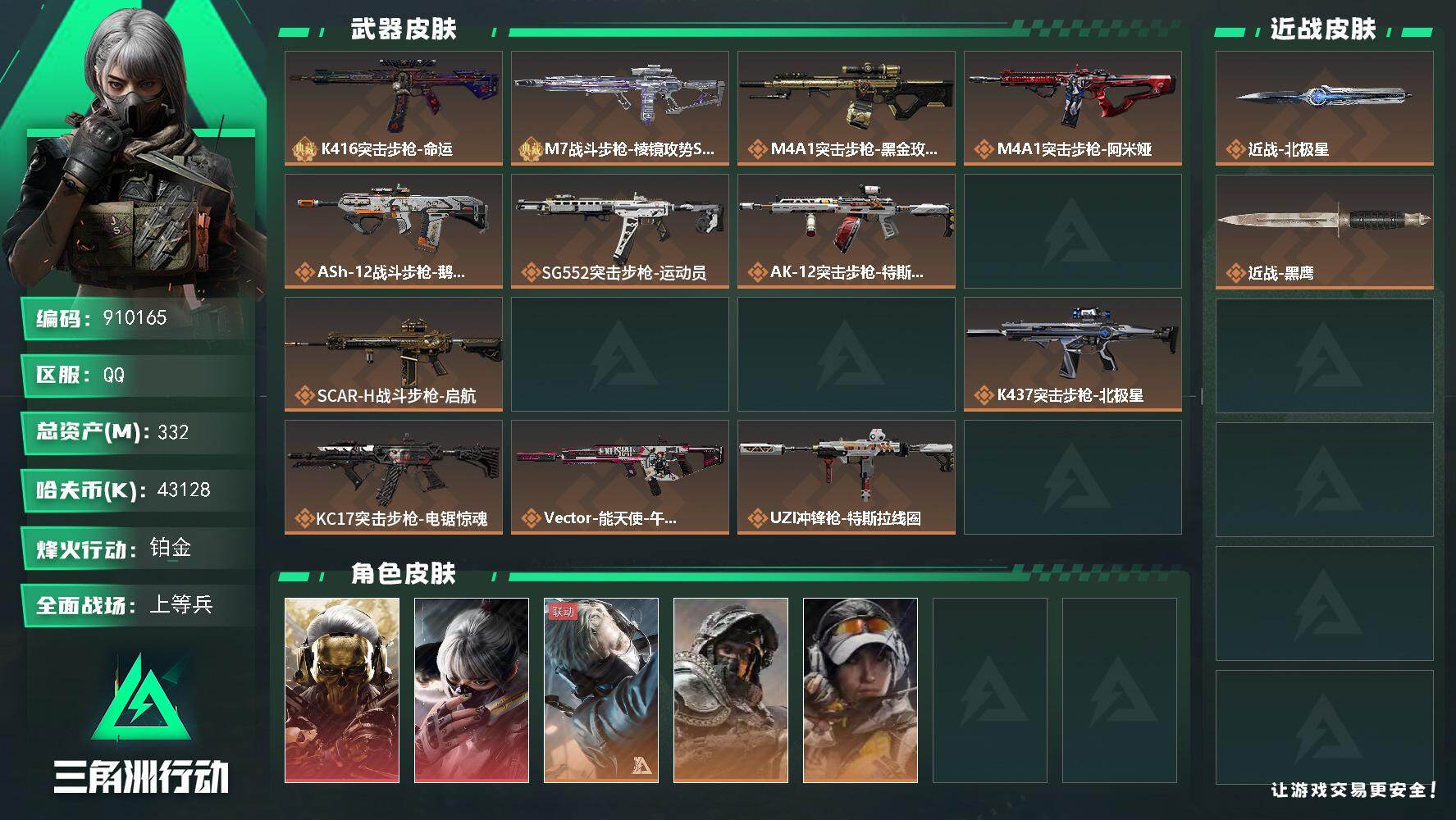 总资产(M):28M/哈夫币(K):3530K/全面战场等级:10_段位:列兵/烽火地带等级:60_段位:钻石/近战-黑鹰/