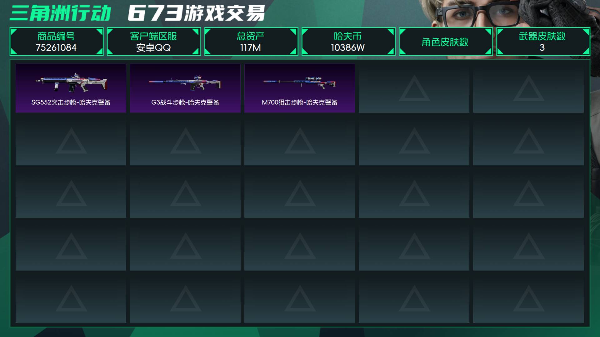 烽火段位暂无段位 战场段位暂无段位 总资产117M 哈夫币10386W 挂饰3 枪械3 载具2
