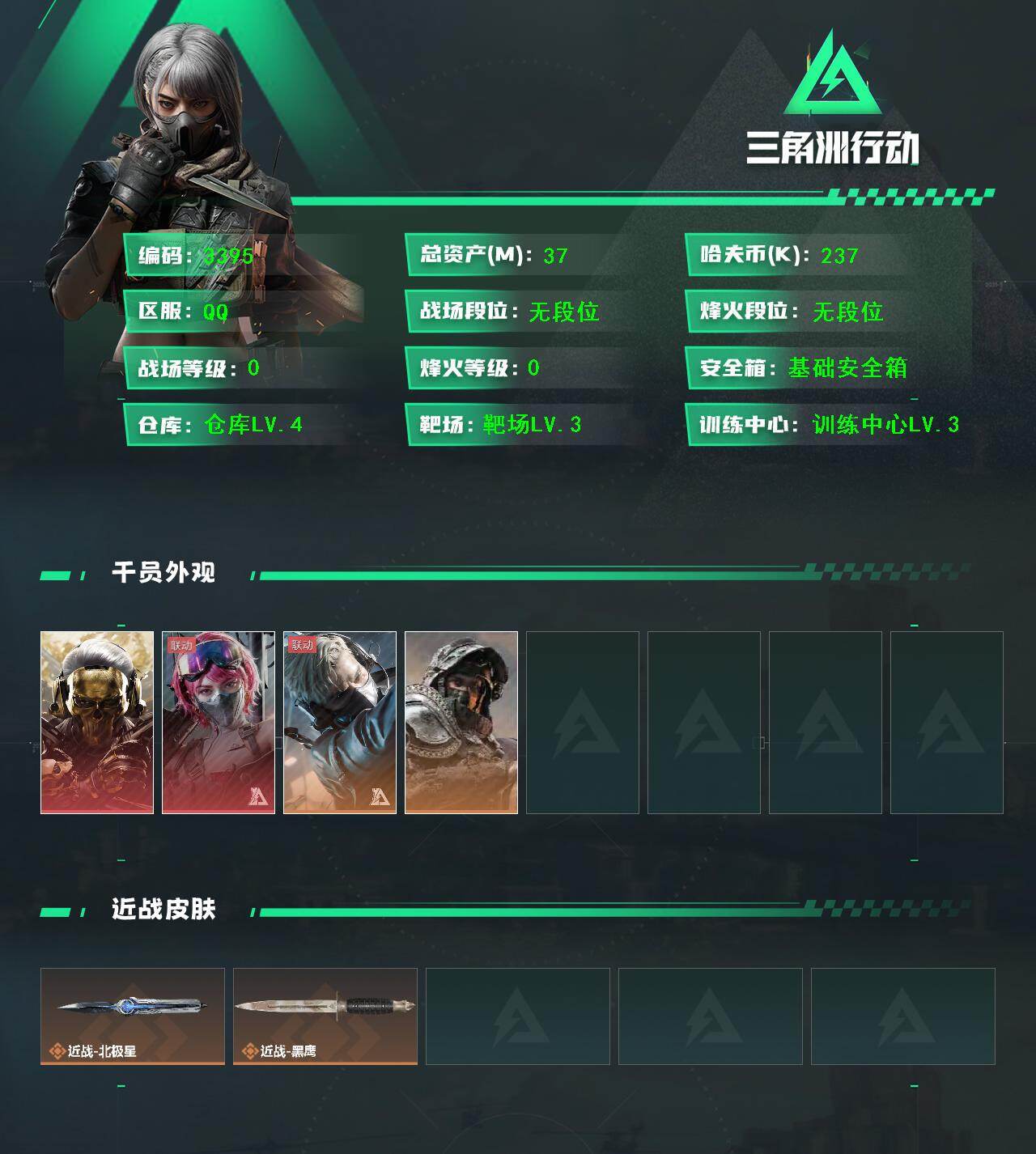总资产(M):4M/哈夫币(K):414K传说枪皮数:1/全面战场等级:7_段位:列兵/烽火地带等级:60_段位:铂金/