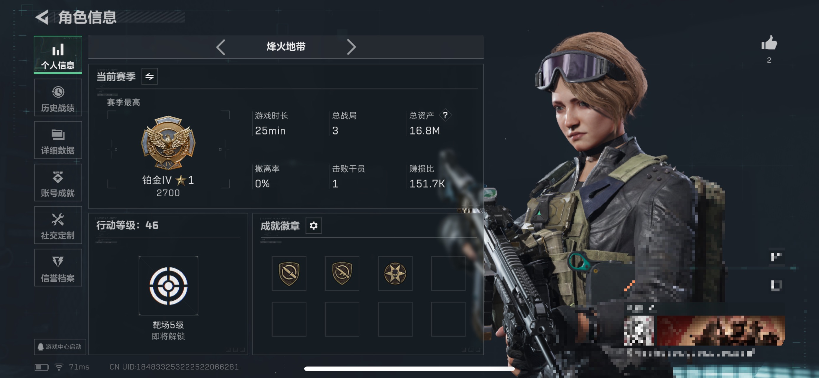 60m总资产-13187k哈伏币-46烽火等级-铂金-22战场等级-上等兵【