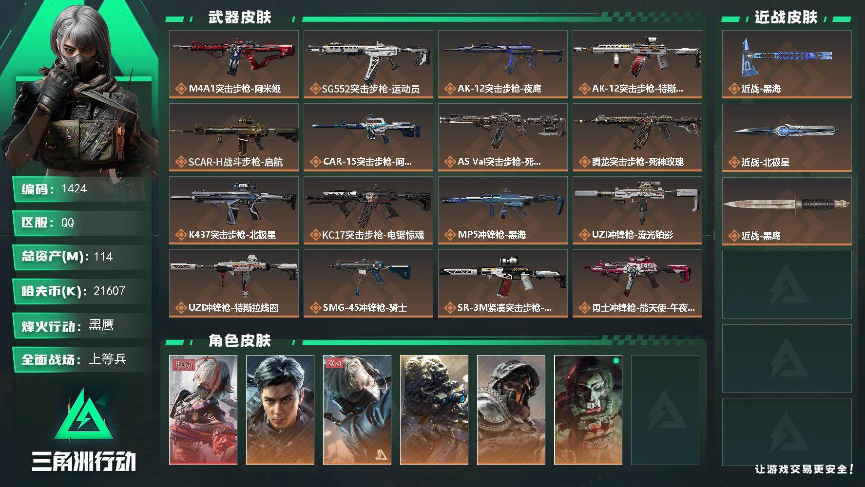 总资产(M):114M/哈夫币(K):21607K/哈夫币(K):21607K/传说枪皮数:25/全