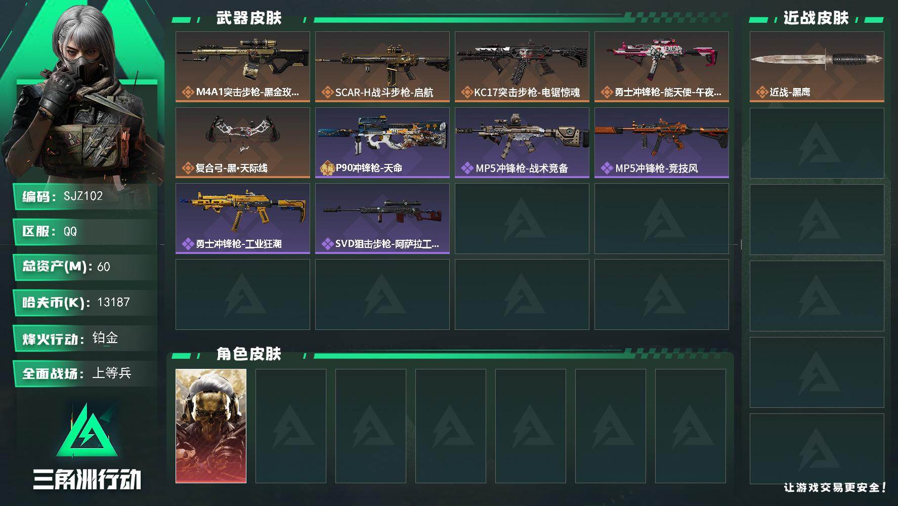 总资产(M):197M/哈夫币(K):2177K/传说枪皮数:12/全面战场等级:18_段位:上等兵/烽火地带等级:60_段位:铂金