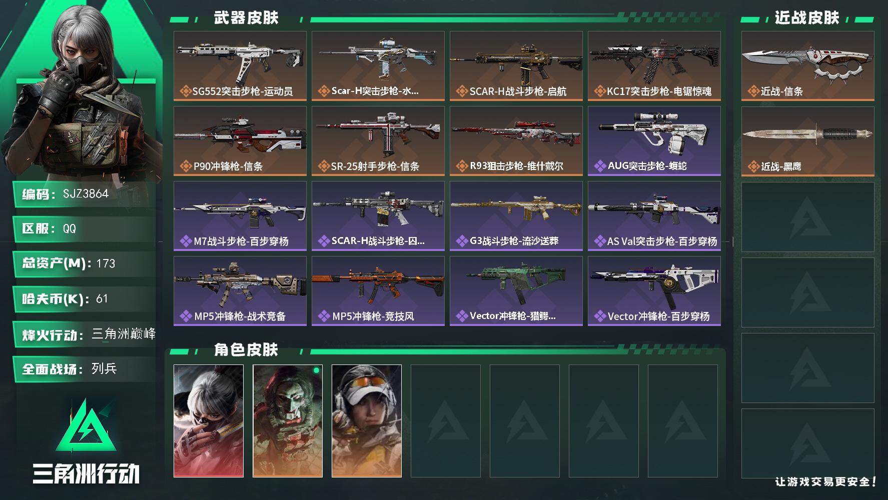 总资产(M):173M/哈夫币(K):61K/传说枪皮数:7/全面战场等级:12_段位:列兵/烽火地带等级:60_段位:三角洲巅峰/