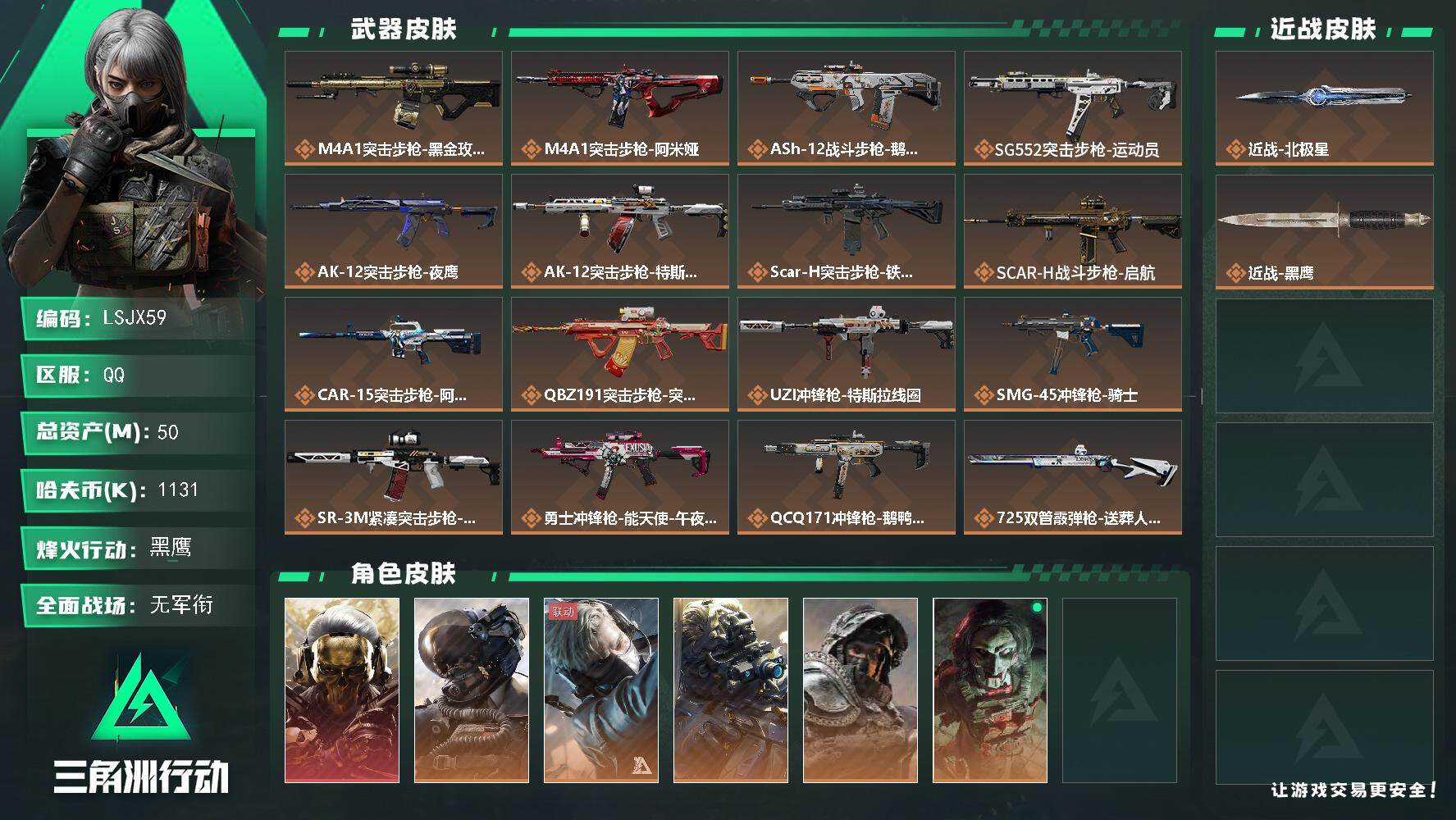 【店主推荐捡漏号!可直接换绑】50m总资产-1131k哈伏币-60烽火等级-黑