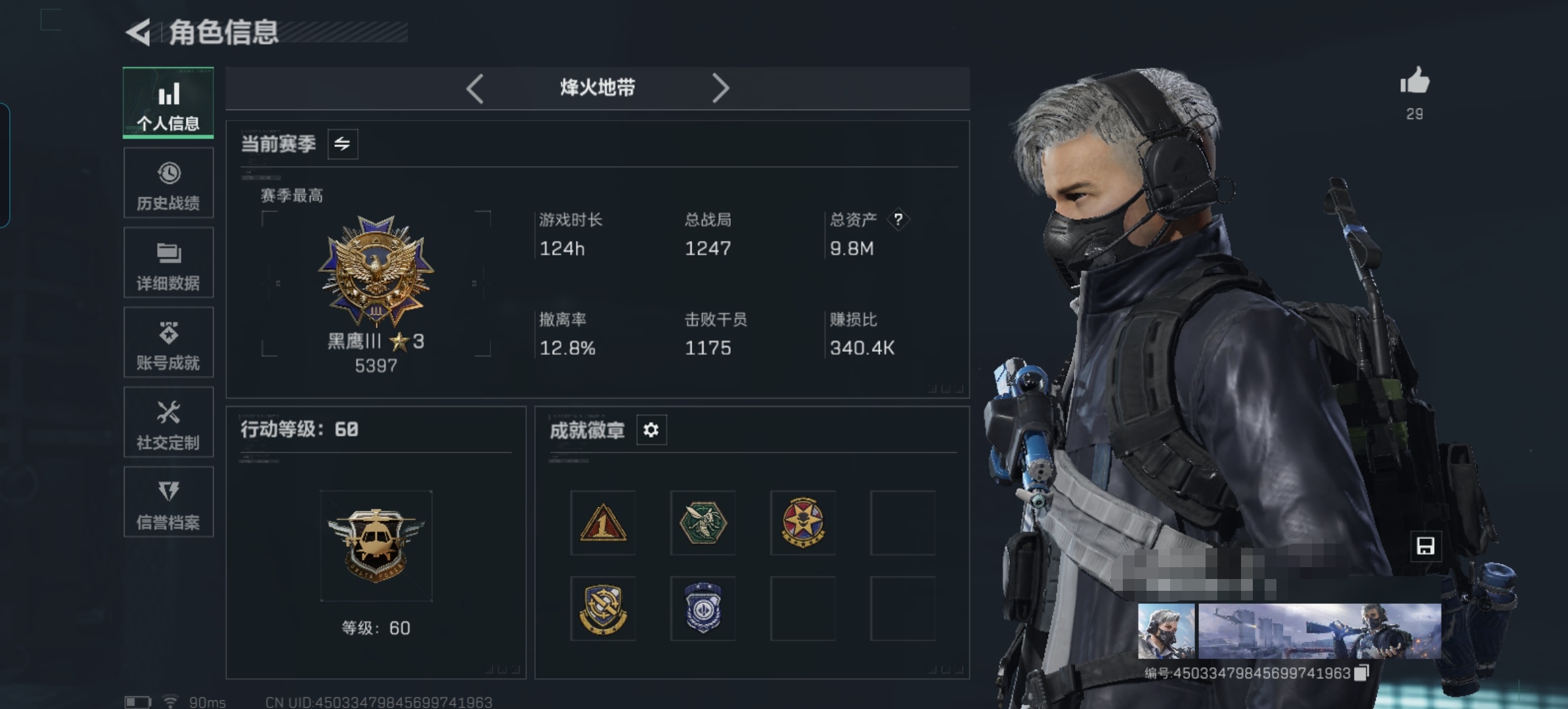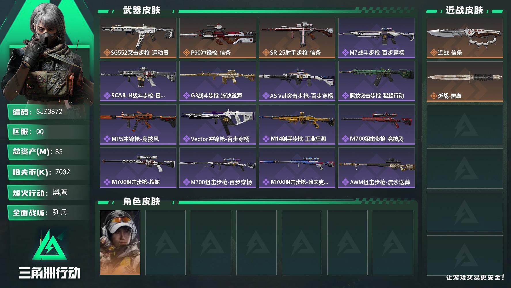 总资产(M):83M/哈夫币(K):7032K/传说枪皮数:3/全面战场等级:8_段位:列兵/烽火地带等级:60_段位:黑鹰/