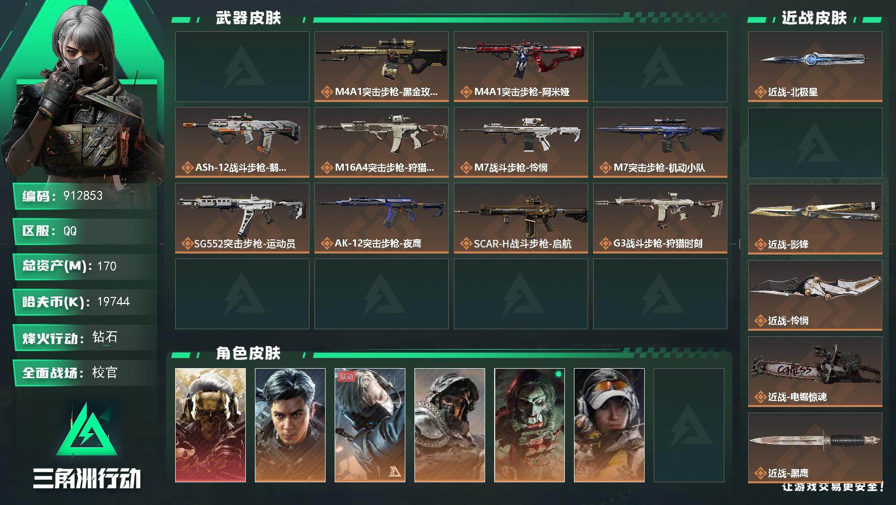 170m总资产-19744k哈夫币-60烽火等级-钻石-50战场等级-校官