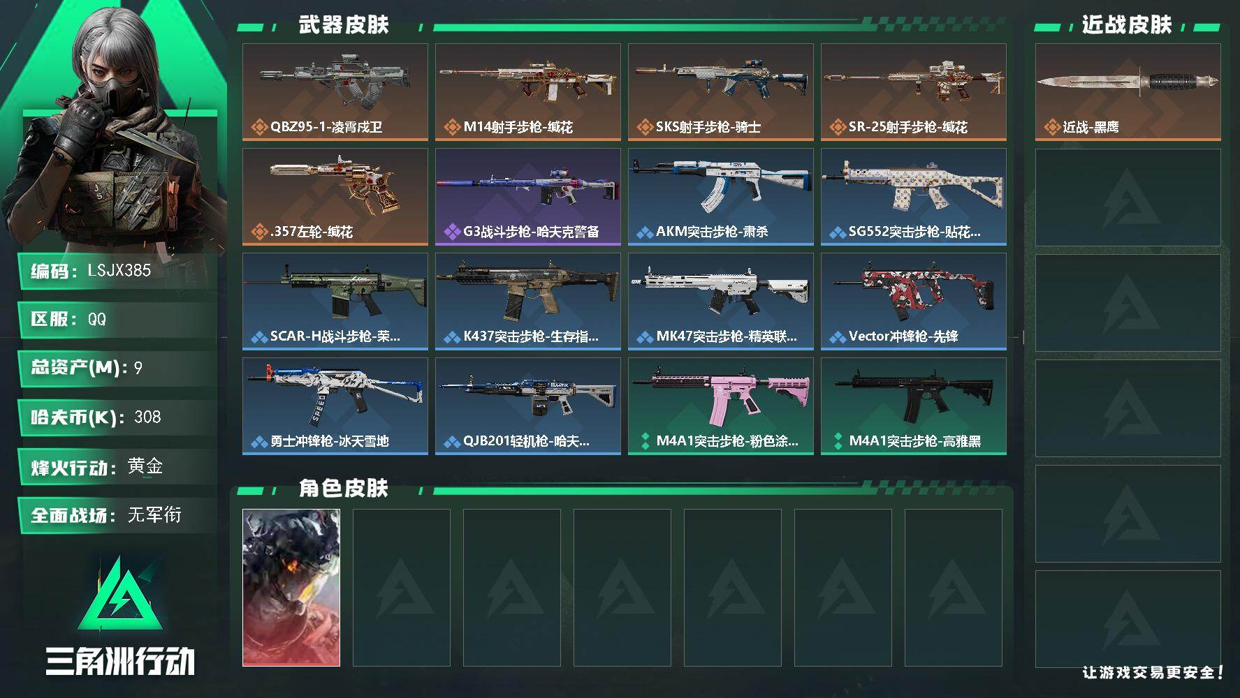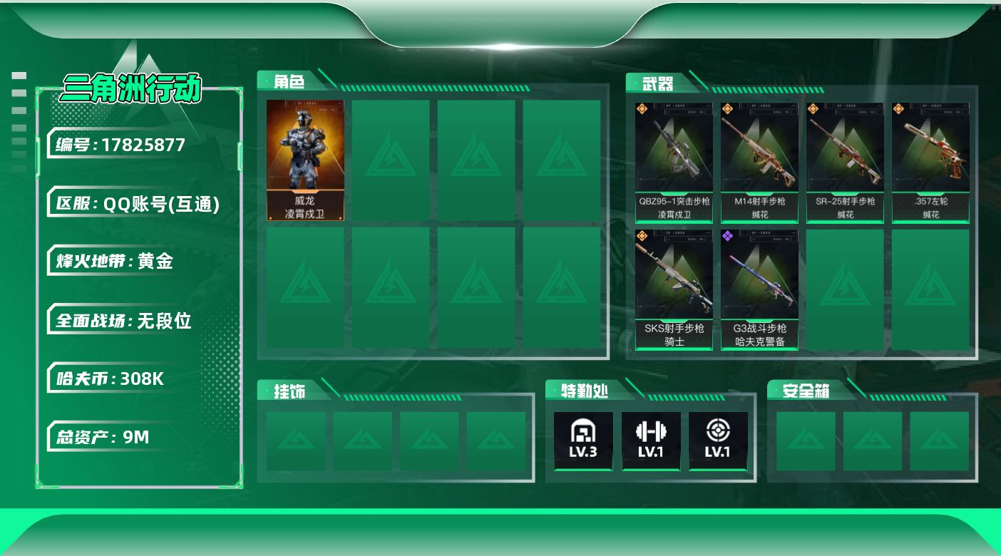 9m总资产-308k哈夫币-41烽火等级-黄金-1战场等级-无军衔【干员外观