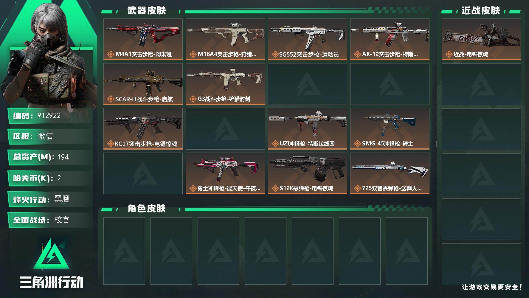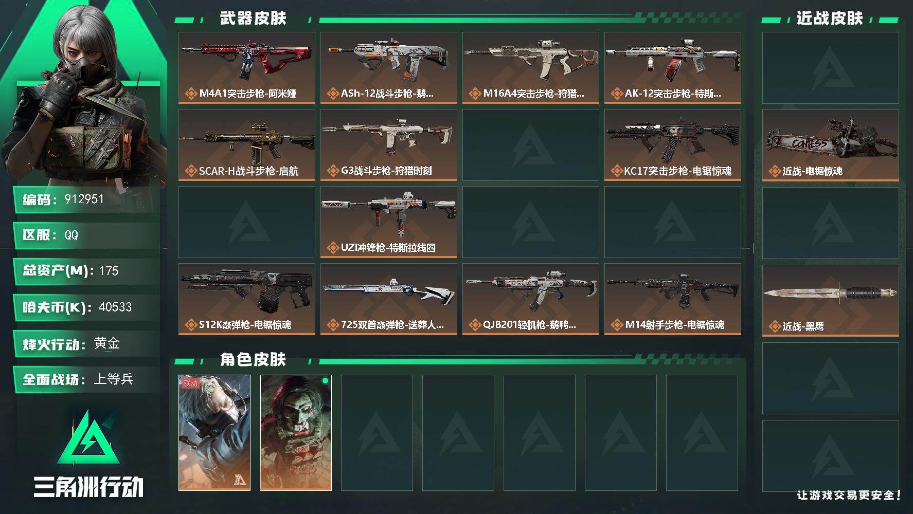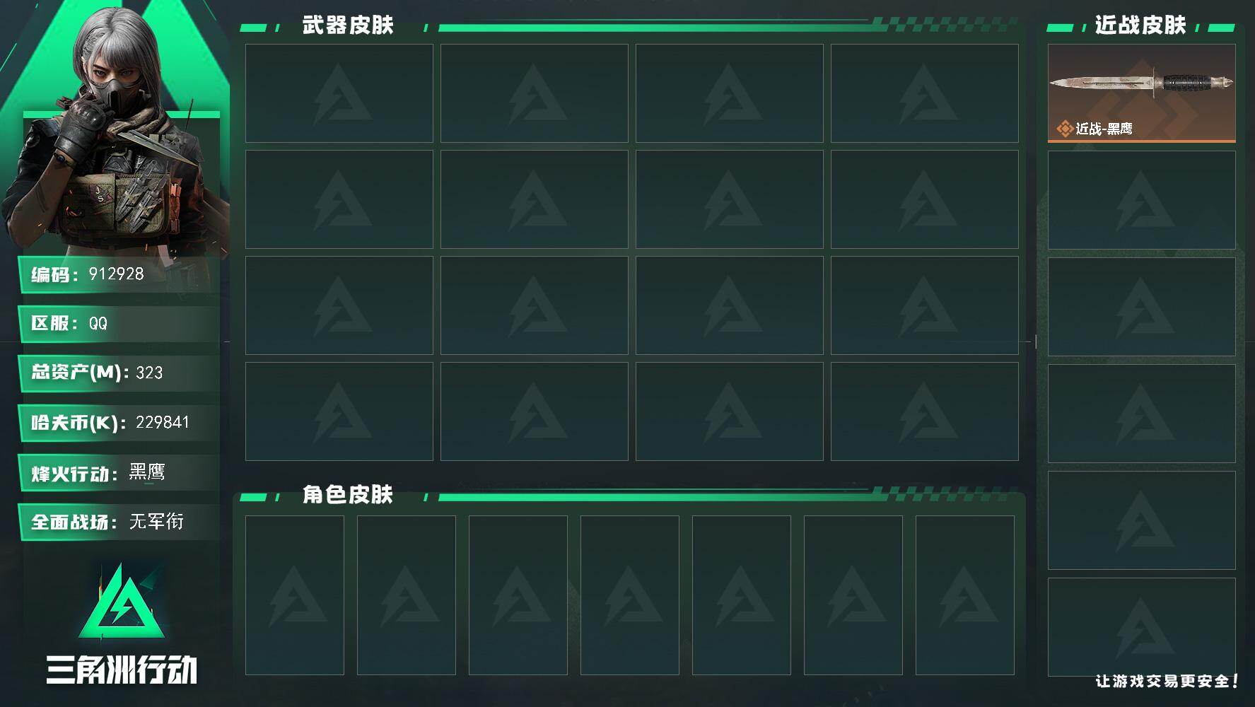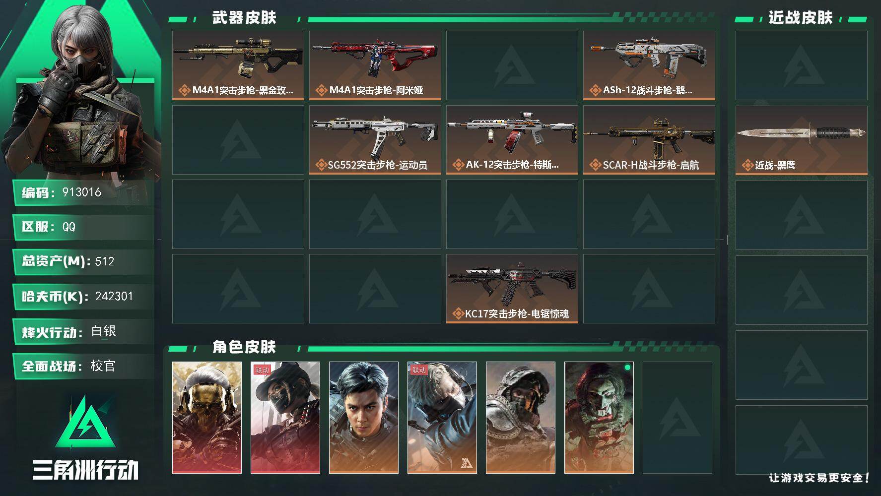 238m总资产-1504k哈夫币-60烽火等级-黑鹰-35战场等级-军士长【