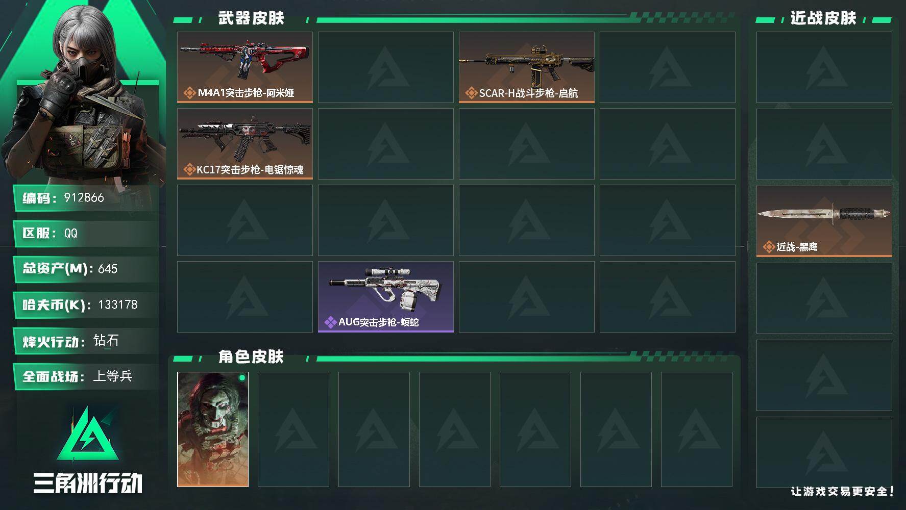 645m总资产-133178k哈夫币-60烽火等级-钻石-28战场等级-上等兵