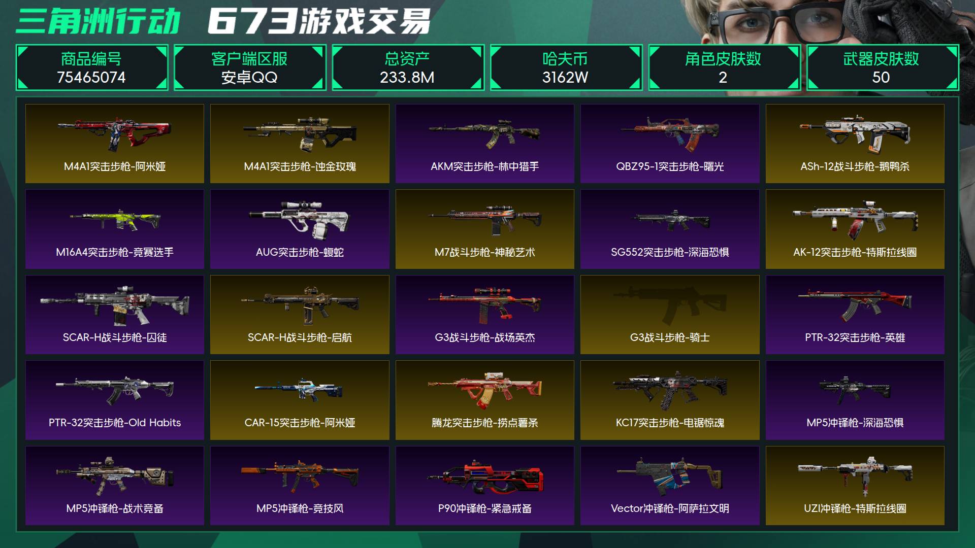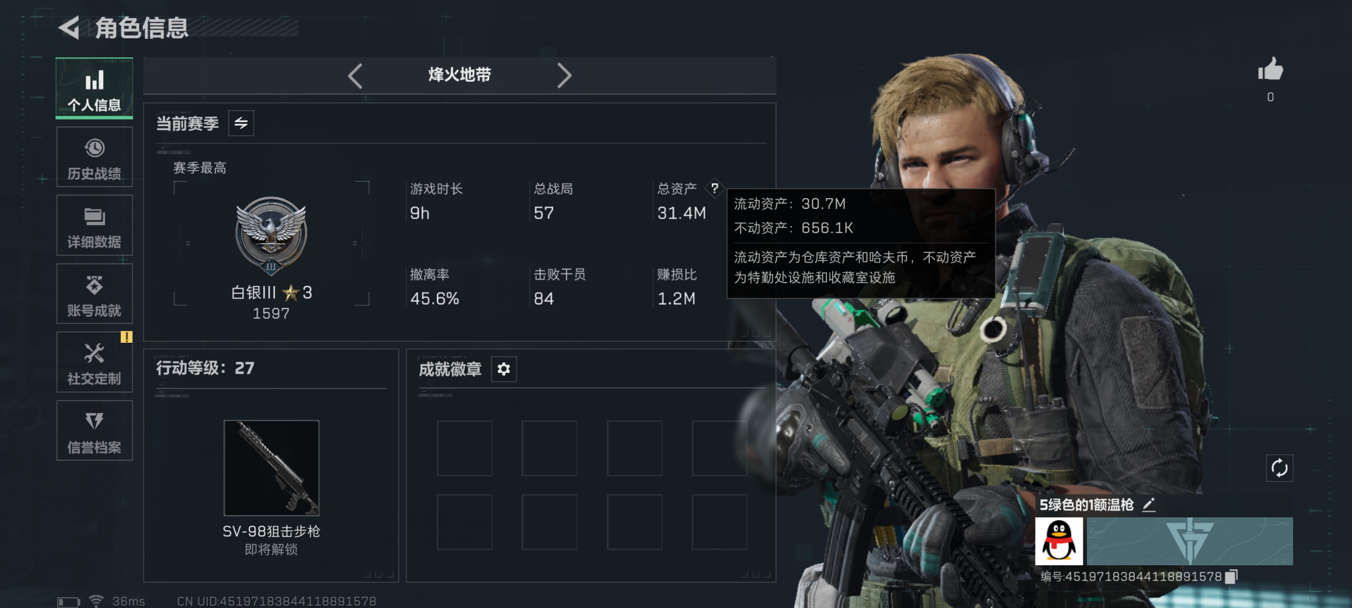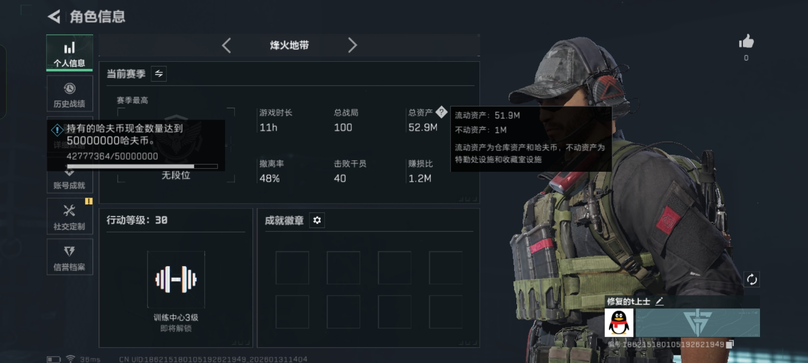 烽火段位铂金3 战场段位列兵1 总资产233.8M 哈夫币3162W 干员2 挂饰24 近战1 枪械50 载具15
