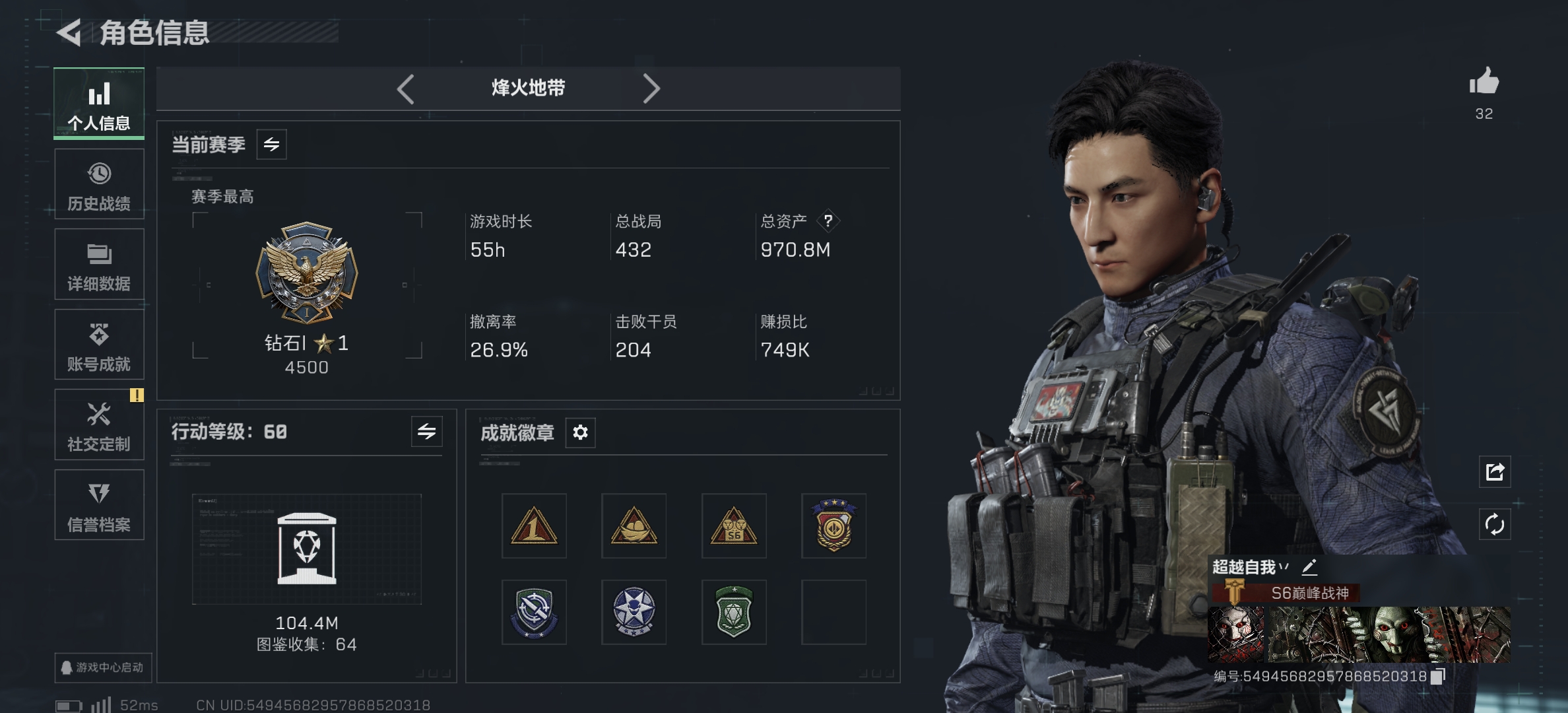 等级:60 总资产:52.4M 哈夫币:196.2W