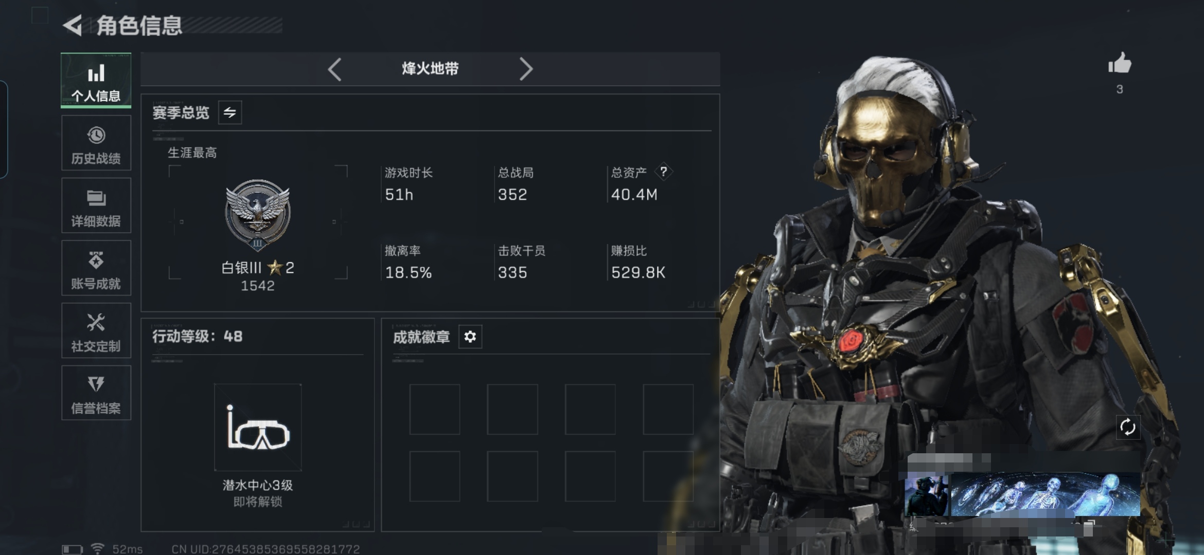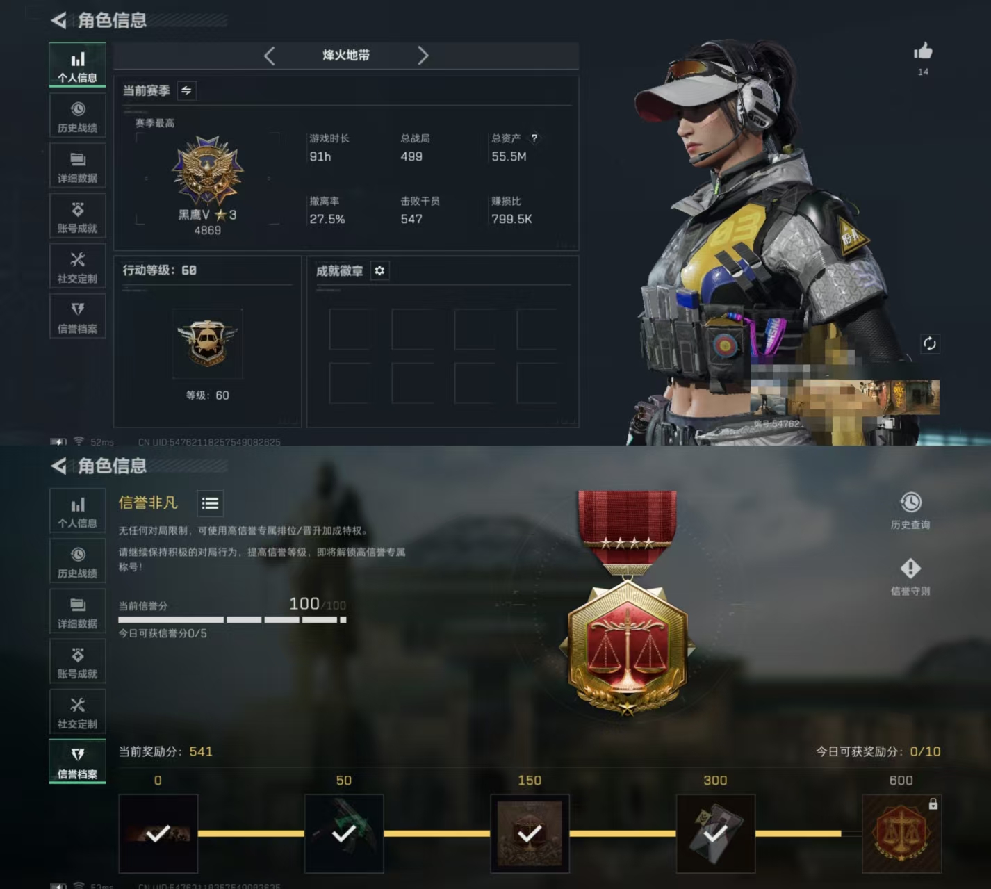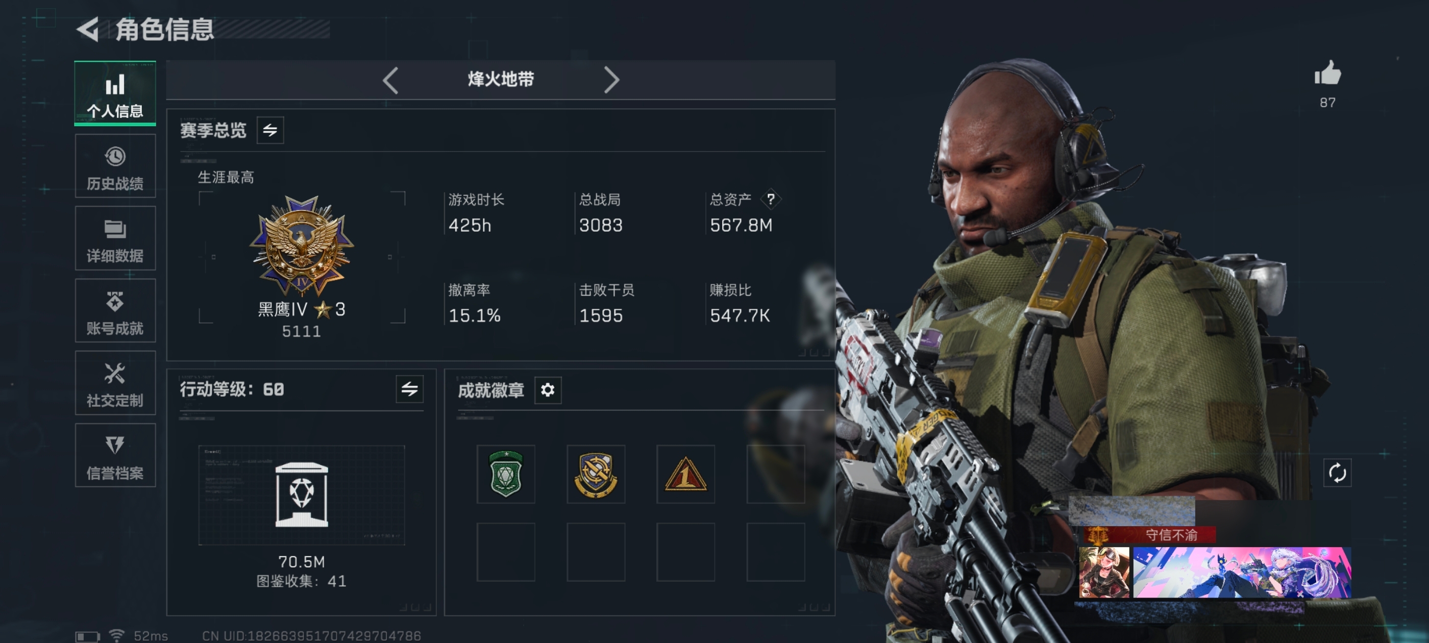 hssjz1286 总资产81.79M,哈夫币 366.93K,战场等级:39 校官,行动等级:60