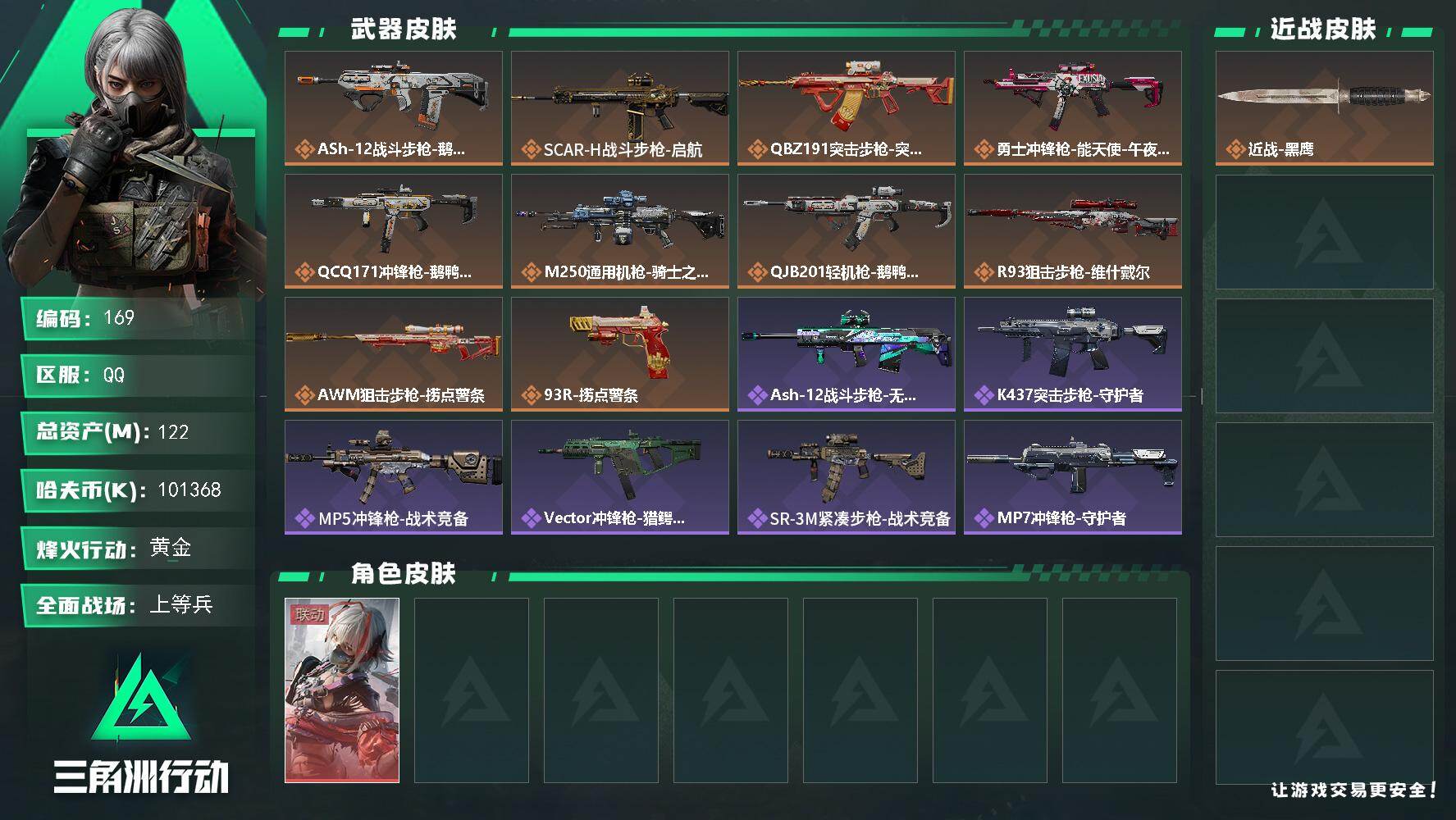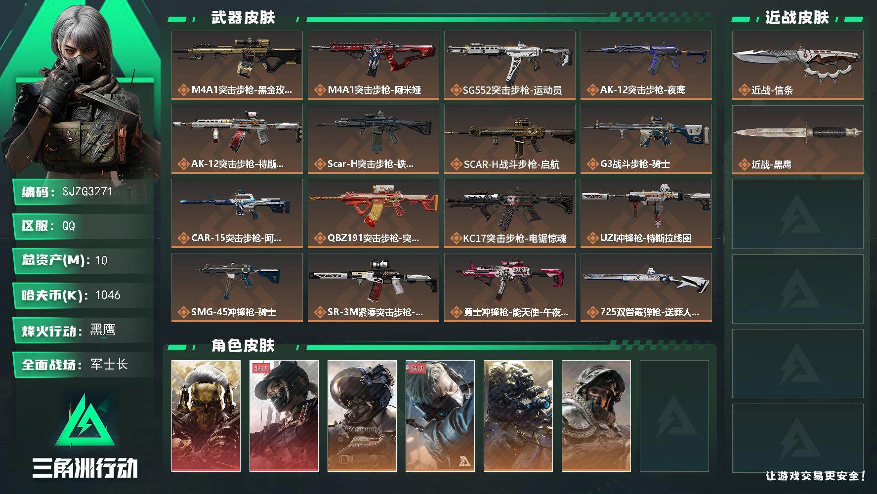 总资产(M):10M/哈夫币(K):1046K/哈夫币(K):1046K/传说枪皮数:21/全面战场