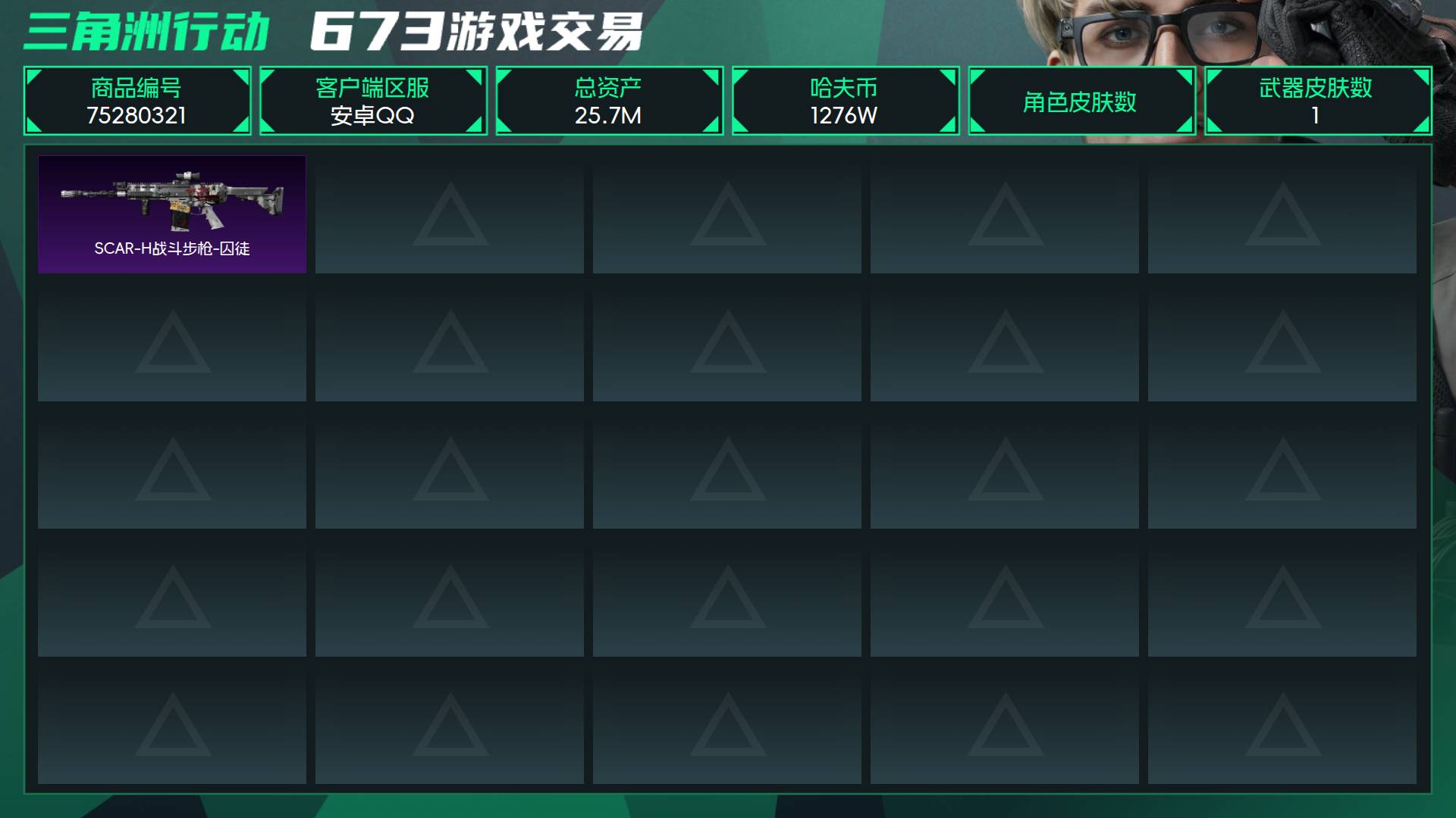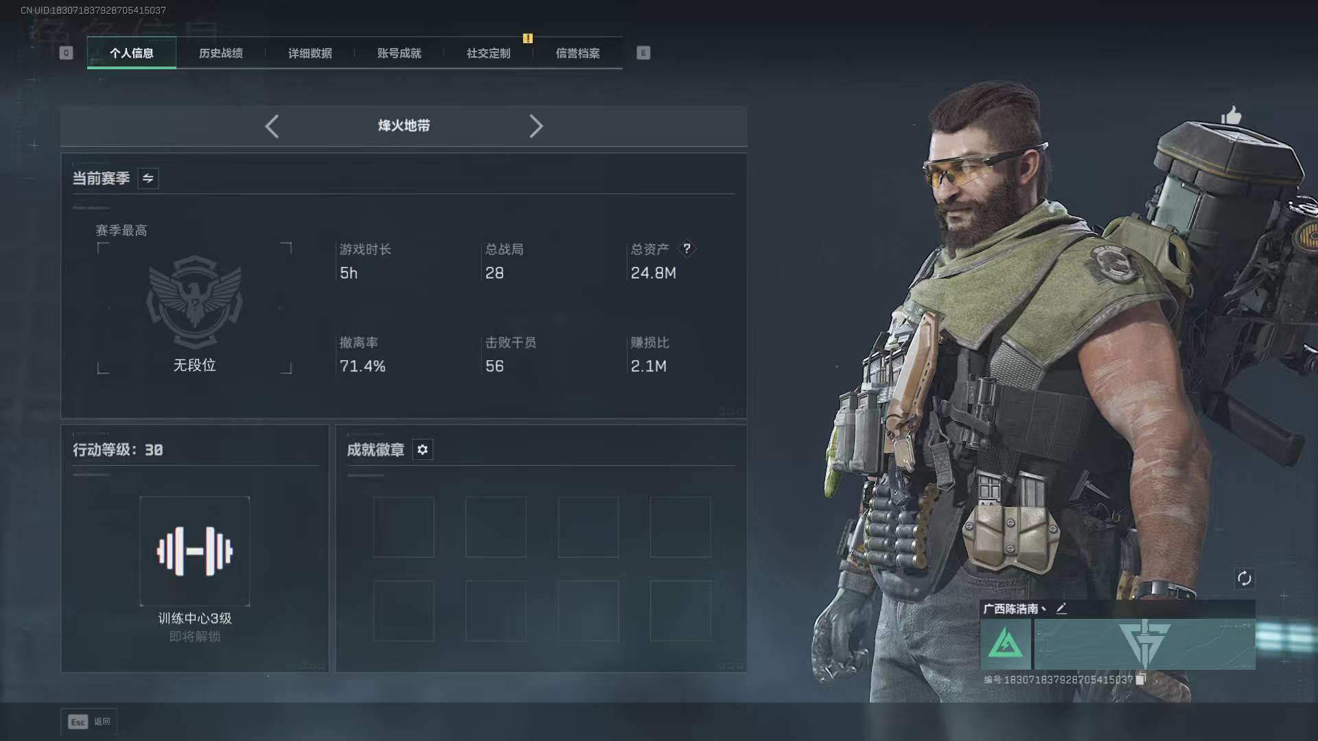 烽火段位黄金3 战场段位暂无段位 总资产25.7M 哈夫币1276W 挂饰2 枪械1 载具2